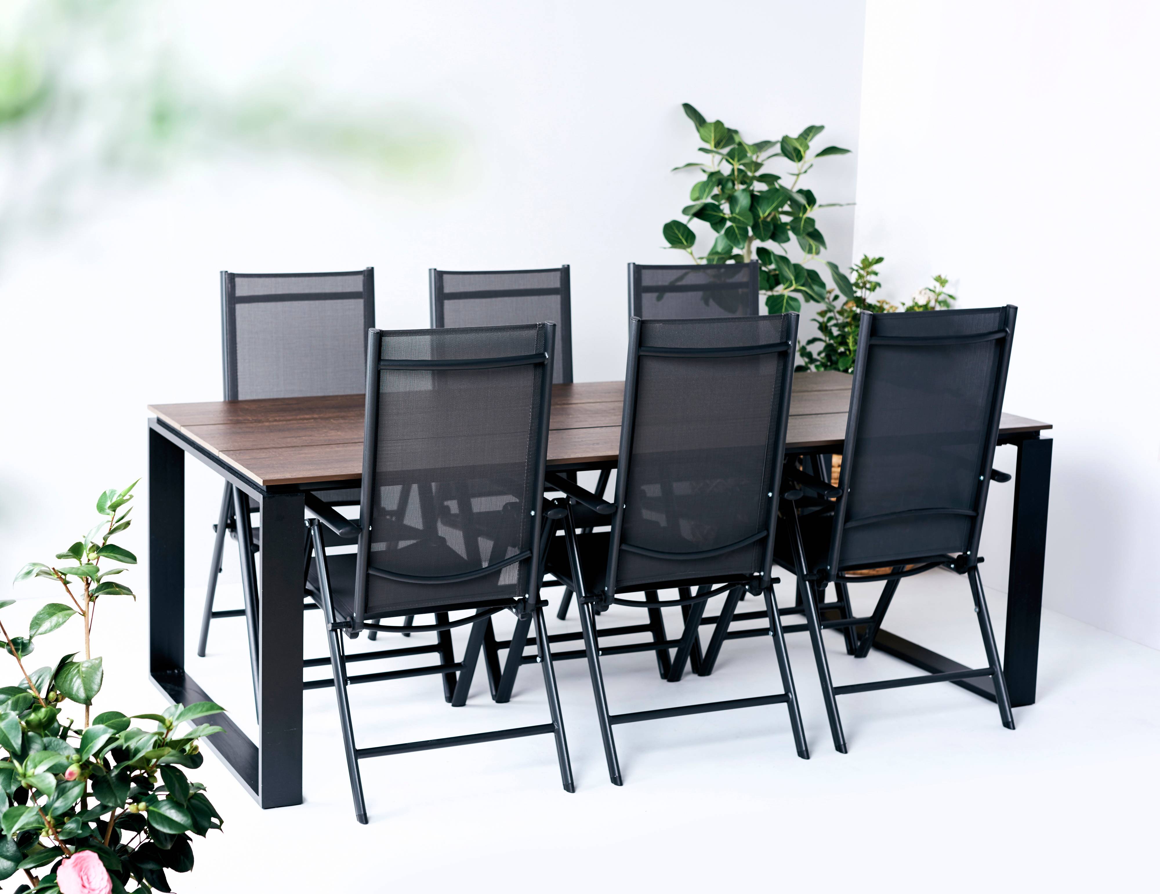 Hagestol med svart stamme av aluminium og svart sete av kraftig meshmateriale. Meshmaterialet er behagelig å sitte på, og det er ikke nødvendig med stolpute. Stolen er enkel å slå sammen, og passer perfekt til gjester. Den har også en trinnløs funksjon som gjør at du nesten kan ligge rett ut.