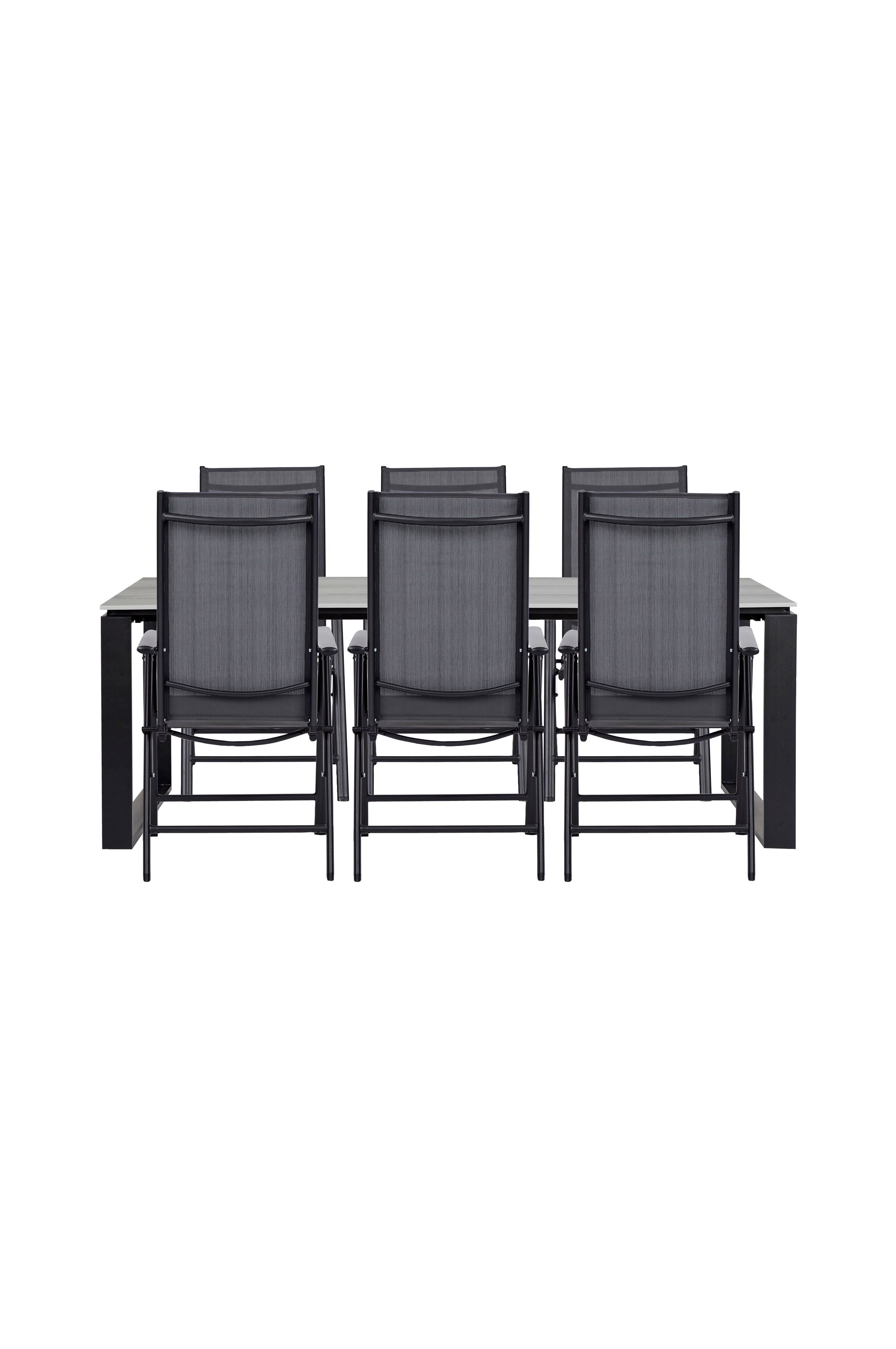 Hagestol med svart stamme av aluminium og svart sete av kraftig meshmateriale. Meshmaterialet er behagelig å sitte på, og det er ikke nødvendig med stolpute. Stolen er enkel å slå sammen, og passer perfekt til gjester. Den har også en trinnløs funksjon som gjør at du nesten kan ligge rett ut.