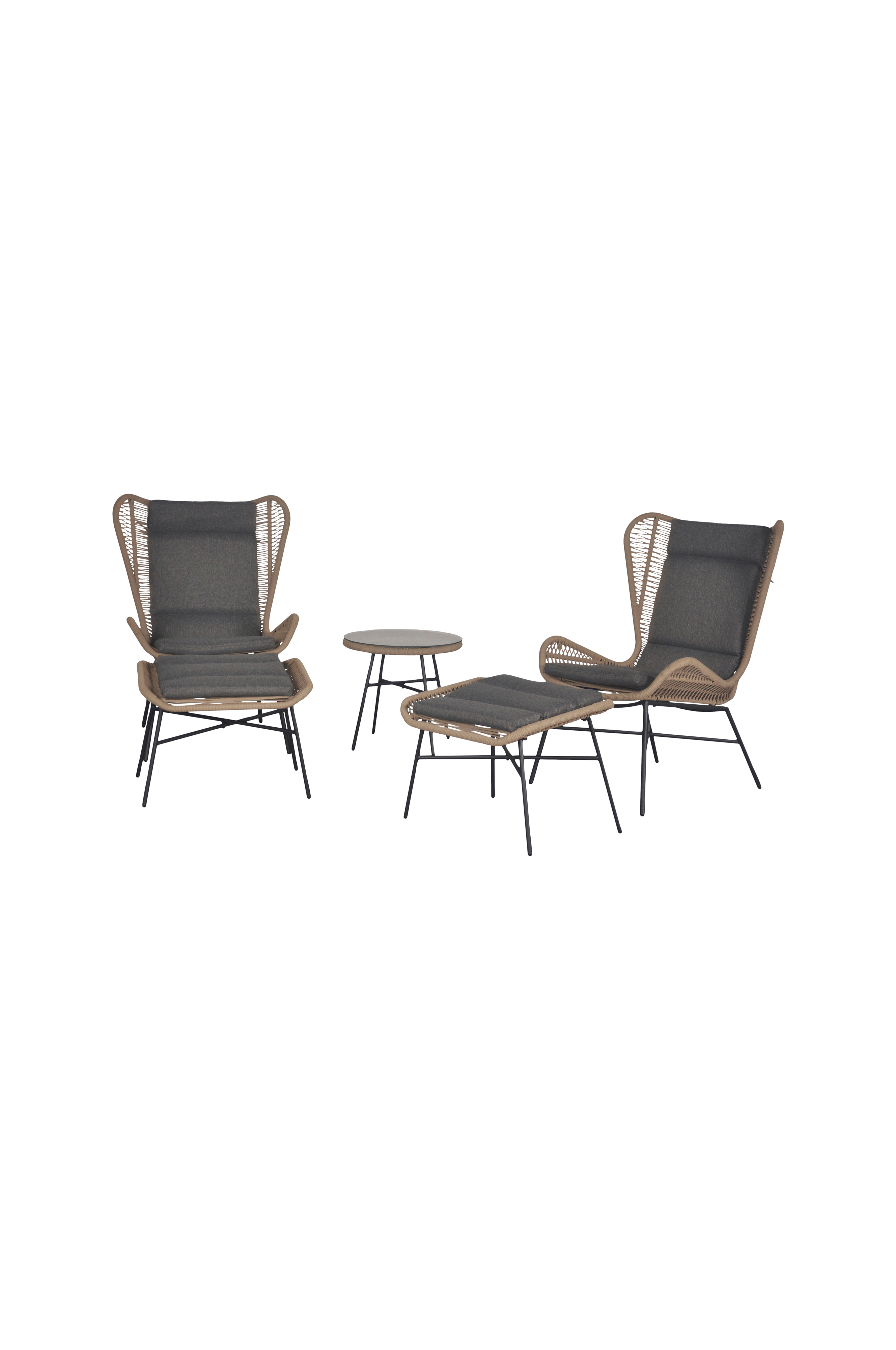 Loungesett til hage eller uteplass, med to stoler, to fotskamler og et sidebord.