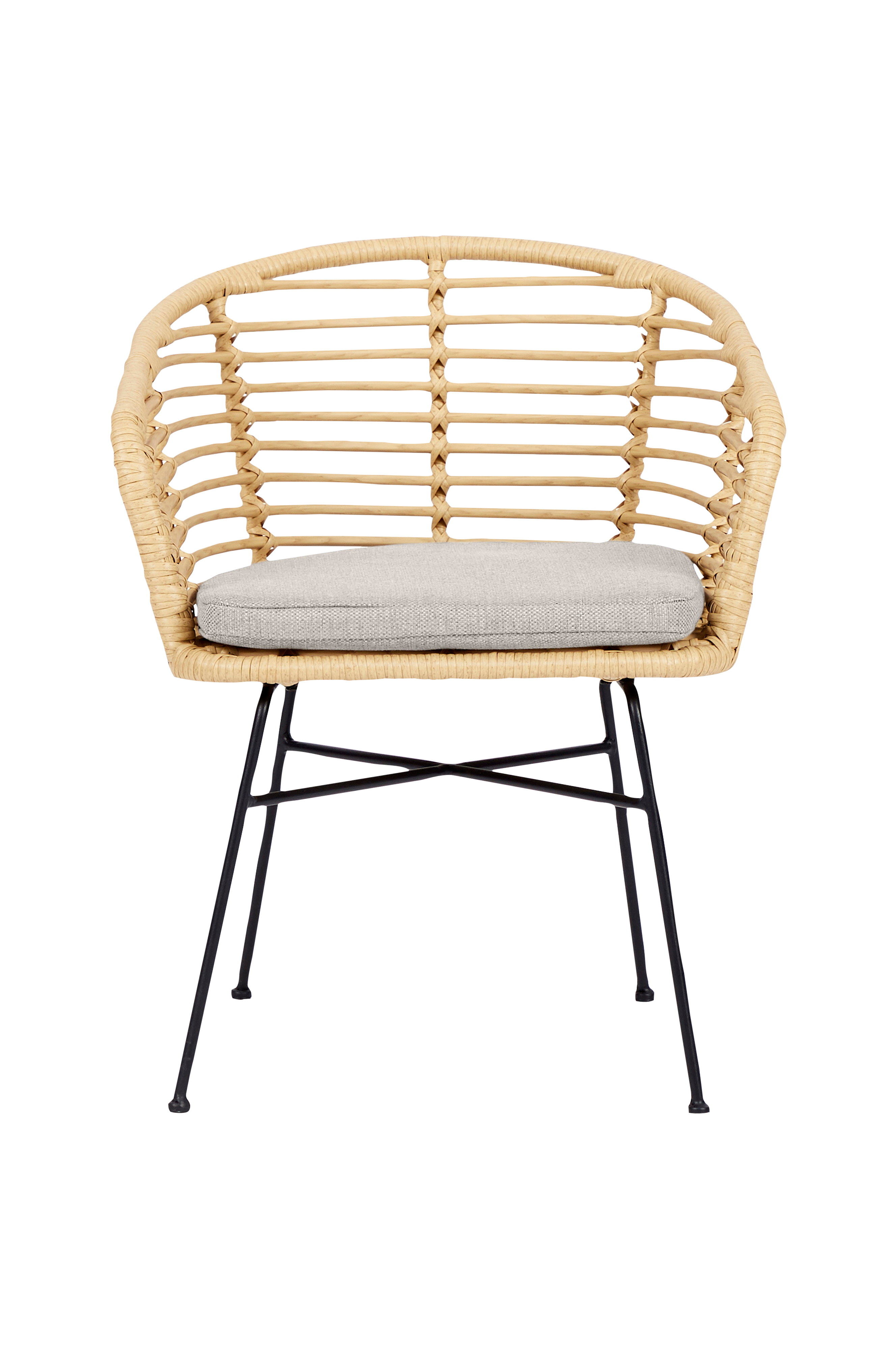 Stol med enkle, men stødige ben av metall, noe som gjør hele stolen stabil. Metallet har et belegg som gjør det vedlikeholdsfritt, noe også polyrottingen er. Setet er produsert av vevd polyrotting med tykke tråder, noe som gir stolen et svært pent utseende. Rotting er ikke bare pen, den er også resistent mot mugg og fukt. Puten er av olefin, et utmerket, vanntett materiale for utendørsputer. Den behagelige og elegante puten følger med.