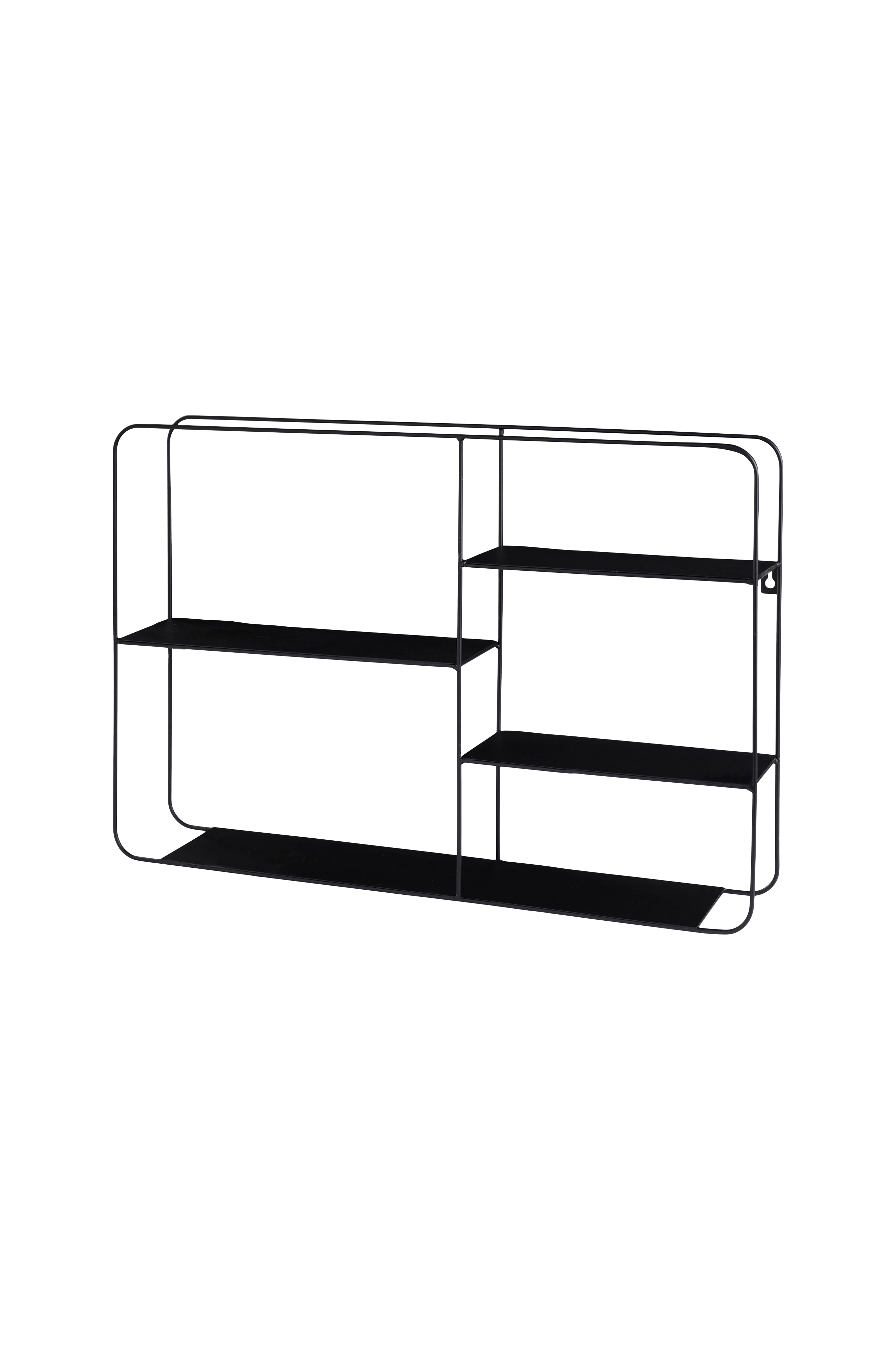 Dekorativ vegghylle i svart farge med tre korte hyller og en bred hylle nederst. Hyllen kan brukes til mange ting, for eksempel til å vise frem gjenstander, kunst og planter med en fin nivåeffekt med hyller i ulike høyder.