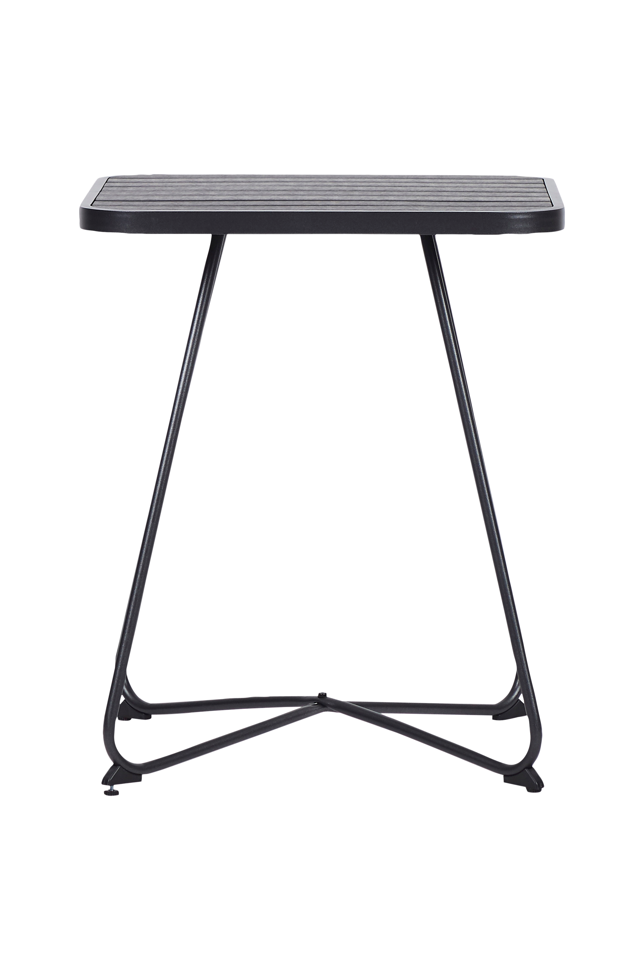 Fint kafébord i aluminium og polywood. Bordet passer perfekt til et par stoler for å nyte en kopp kaffe eller bare ha det hyggelig i hagen. Laget i moderne design med svart metall og bord i polywood med furu-look.