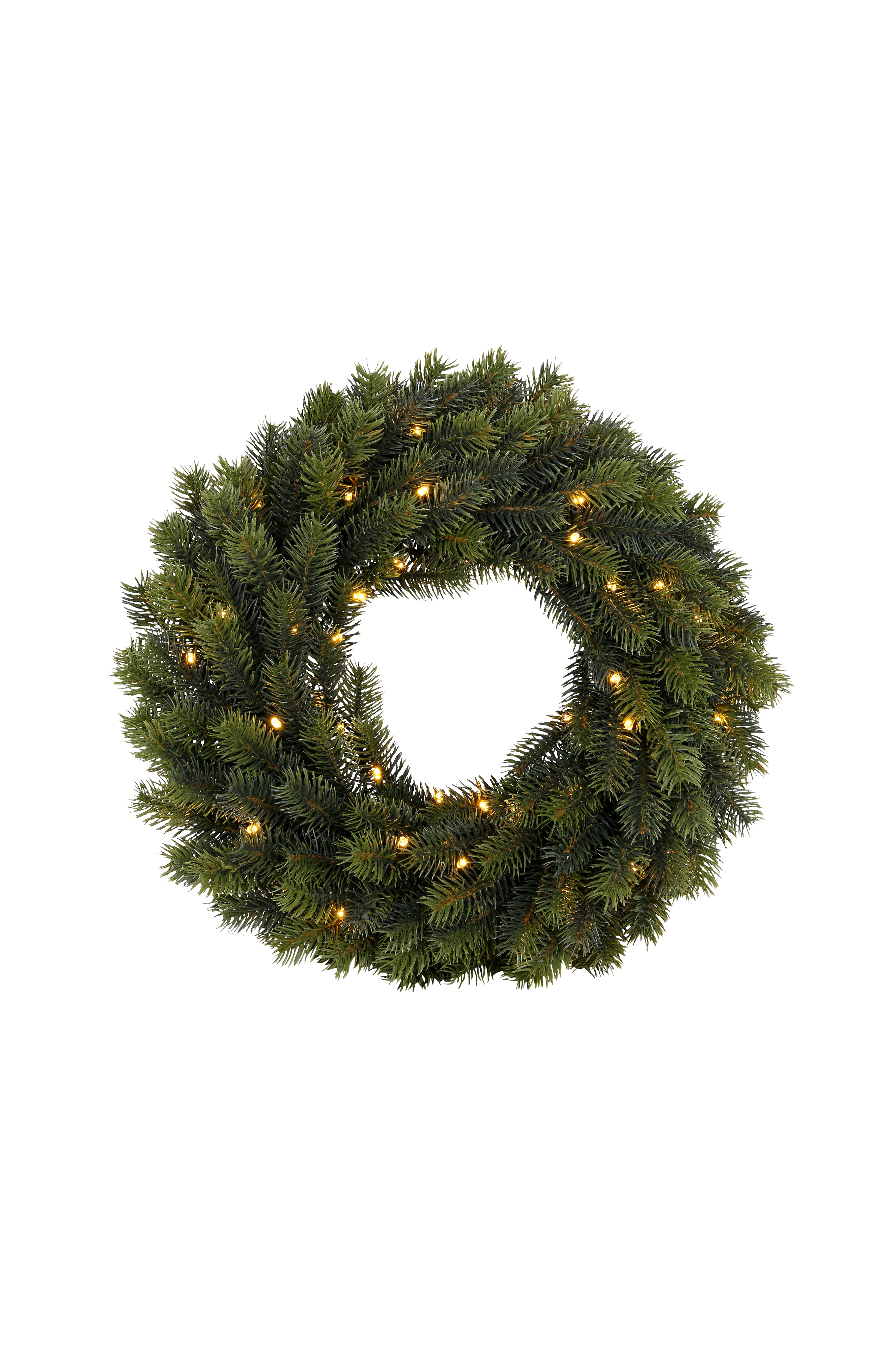 Stemningsfull julekrans med 49 LED-pærer og tidsurfunksjon med 6 timer på, 18 timer av. Kransen har diameter på 40 cm.