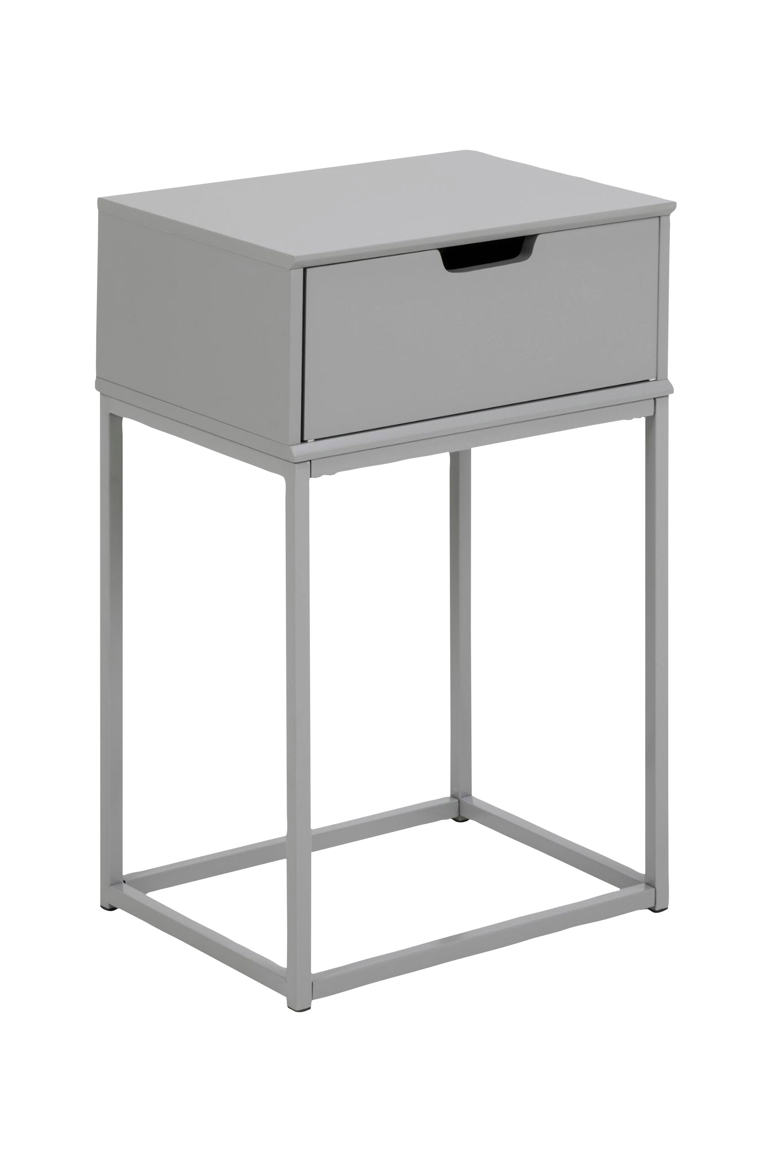 Minimalistisk og funksjonelt nattbord med en skuff. Takket være den kompakte størrelsen passer det også inn i små soverom. Den firkantede metallkonstruksjonen og den grå fargen gir nattbordet en moderne følelse, noe som gjør det vanskelig å finne en bedre følgesvenn til sengen.