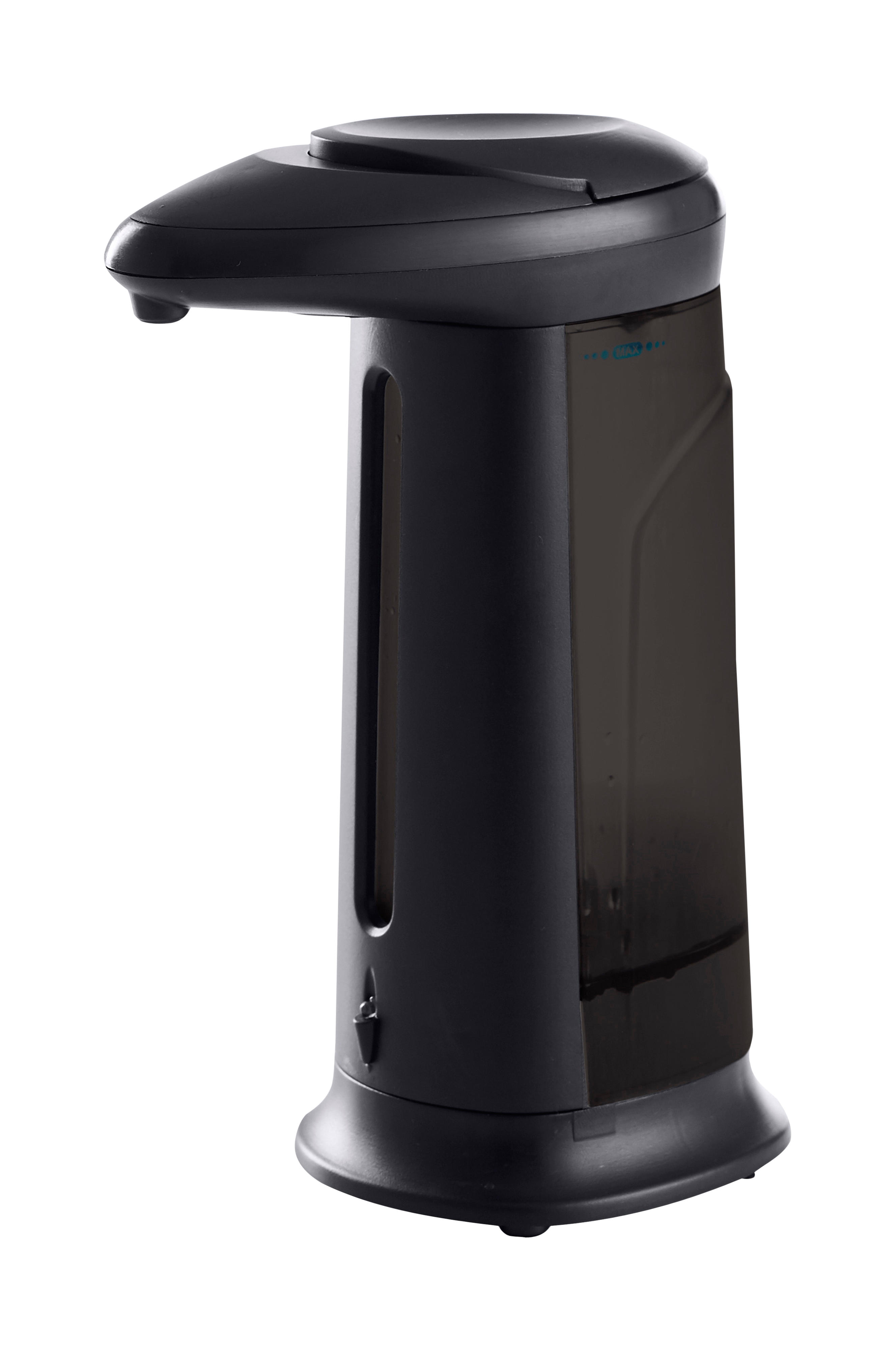Høy, svart, gjennomsiktig såpedispenser med enkel påfylling og en kapasitet på 210 ml. Kan fylles med de fleste typer flytende såpe, håndgel og hånddesinfeksjonsmiddel.