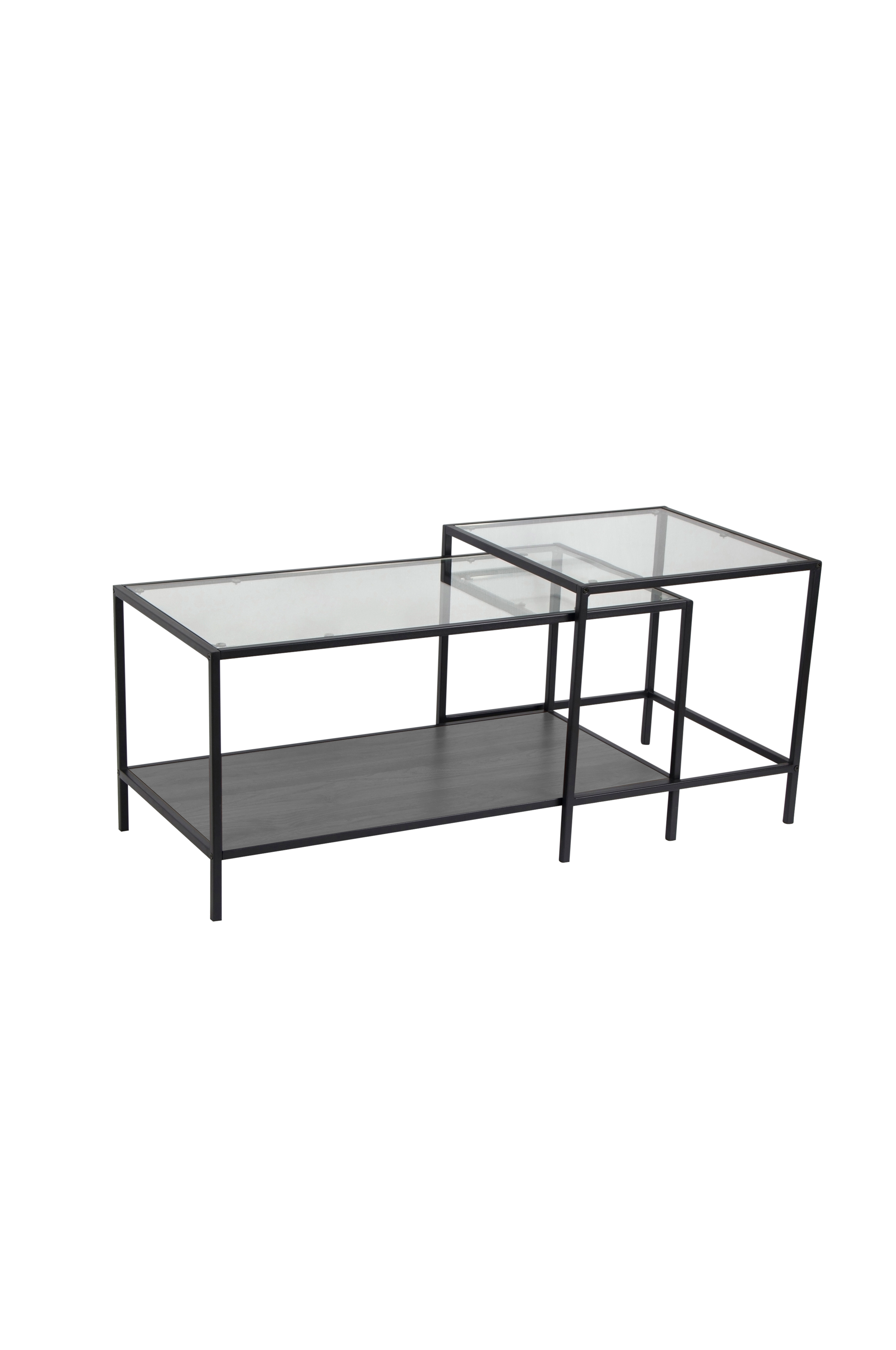 Settbord Agust. Bordplate av 6 mm klart glass. Den nederste platen er melamin på MDF med pulverlakkert metallstamme. Mål: det store bordet: 50x90 cm, høyde 45 cm. Minste bordet; 55 X 55 cm, høyde 50 cm. Leveres umontert.