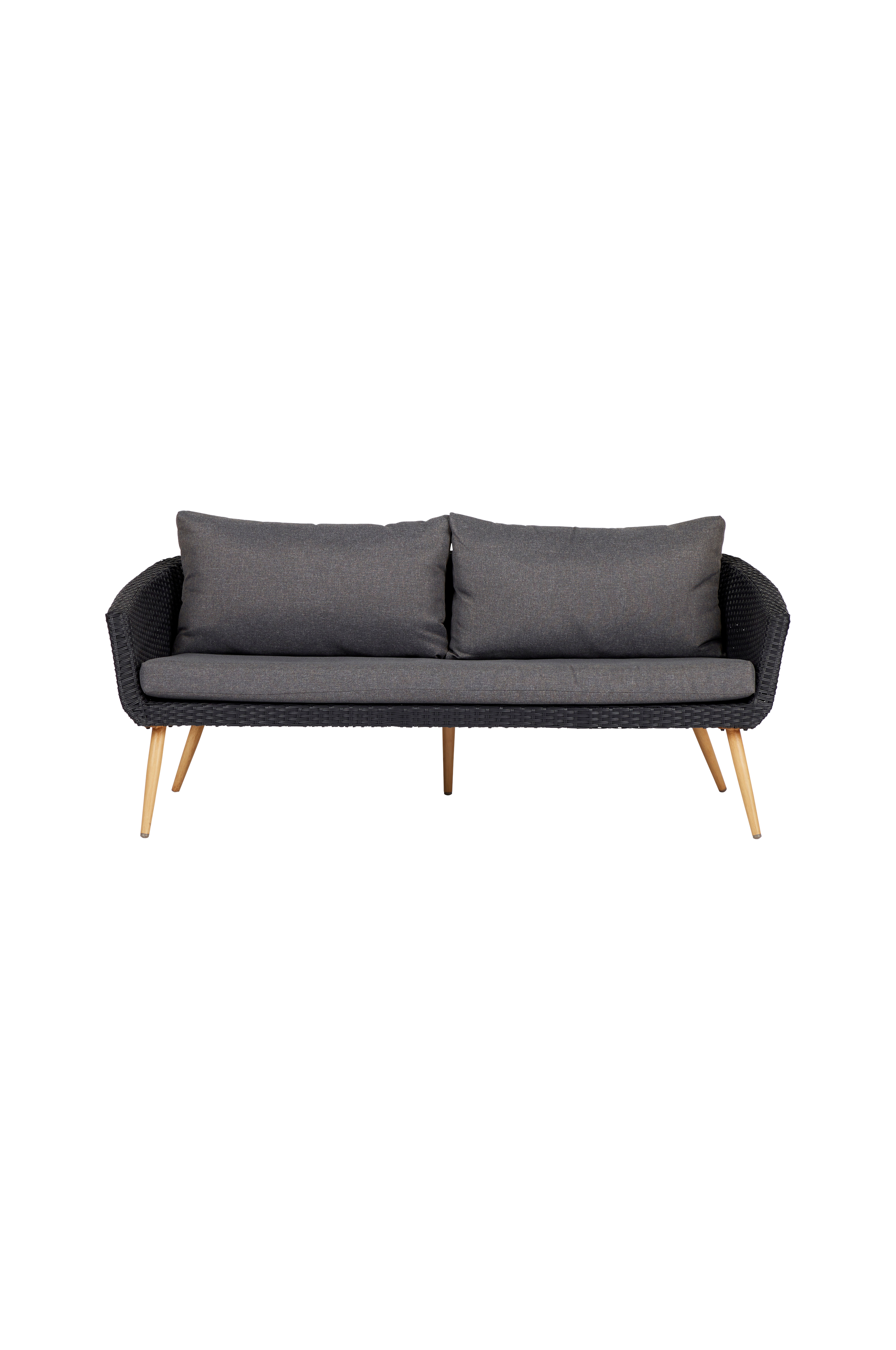 3-seters sofa med puter og aluminiumben i trefarge. Sofaen er stilig med håndvevd polyrotting og stamme av aluminium. Veven dekker hele stammen og gir en ellers enkel konstruksjon noen fine detaljer som passer inn i de fleste sittegrupper. Polyrotting er et fantastisk materiale som er resistent mot mugg og fukt. Putene er av polyester og er vannavvisende.