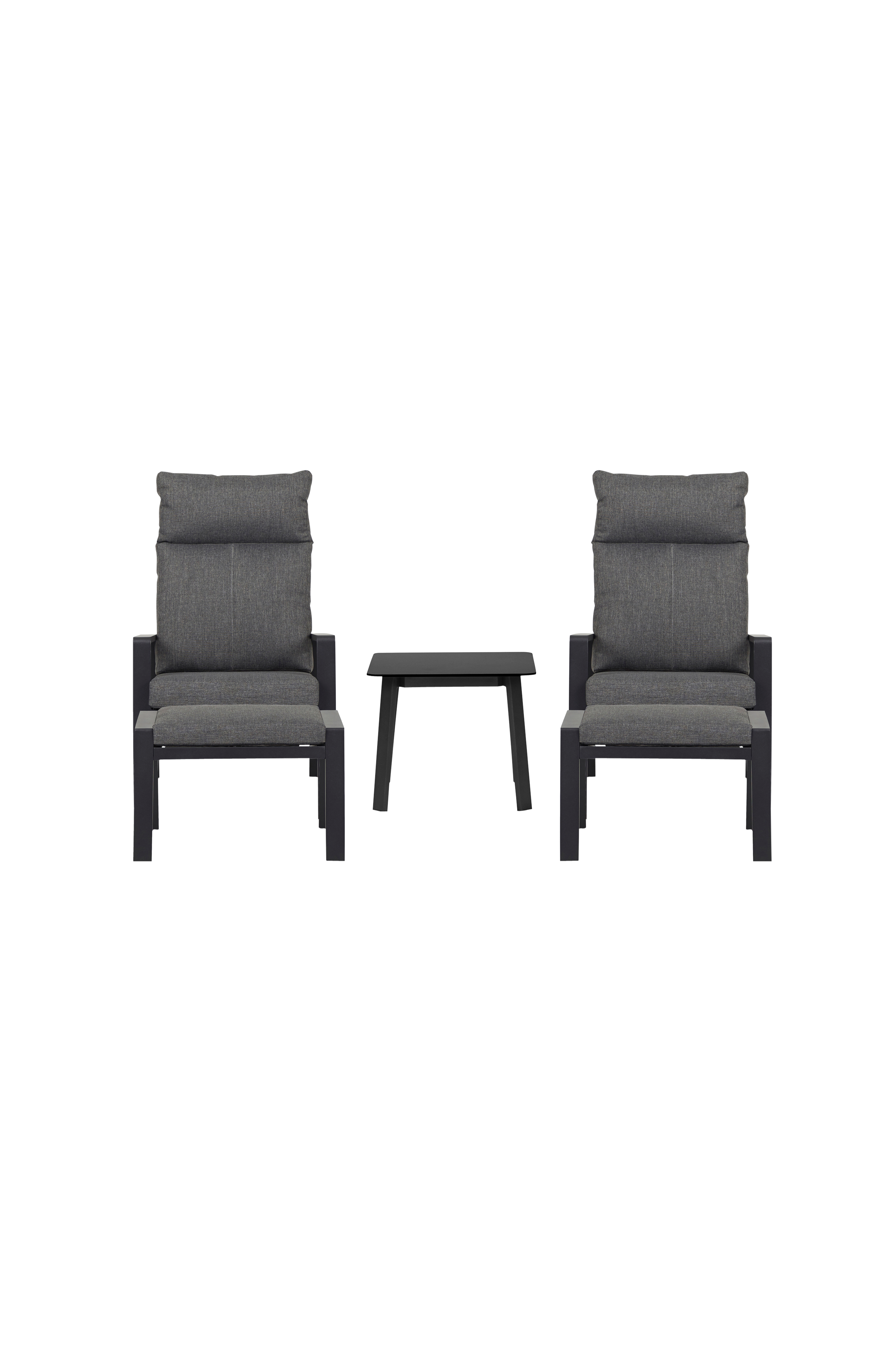 Hagesett med to stoler med trinnløs funksjon, to fotskamler og et lite sidebord. Stammen er av svart aluminium og formet til lange, brede stenger, som utgjør ben og sete på både stol og fotskammel. Stolen kan felles helt ned, og setter du opp føttene fungerer den som solstol. Putene er laget av polyester i grå farge. De er vannavvisende og behagelige å sitte på.