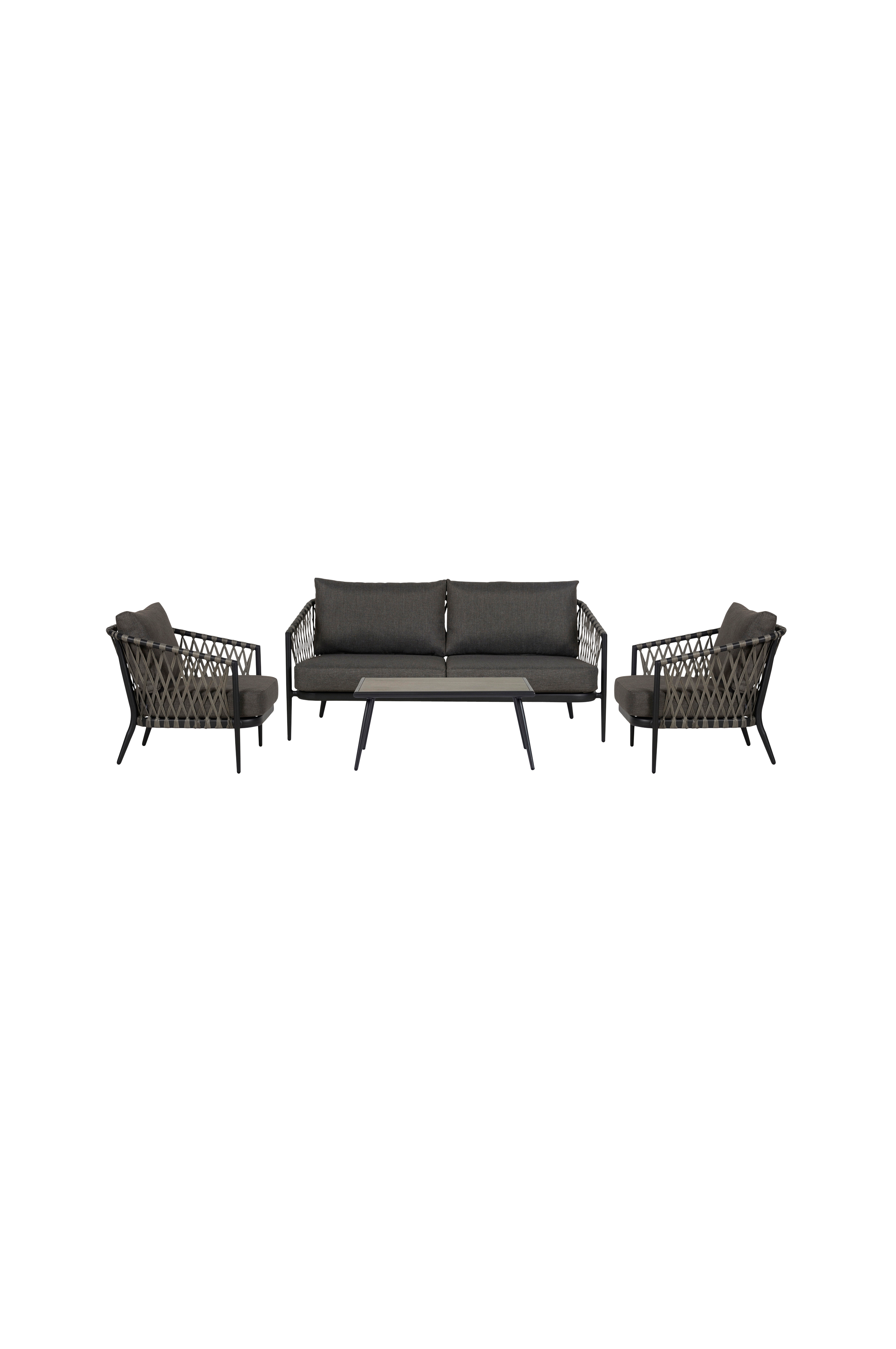 Sofagruppe med to stoler, et bord og en sofa. Møblene er herlige å sitte i, putene er tykke og behagelige. Svart stamme, flettet polyrotting og tykke, vanntette polyesterputer i grå farge.