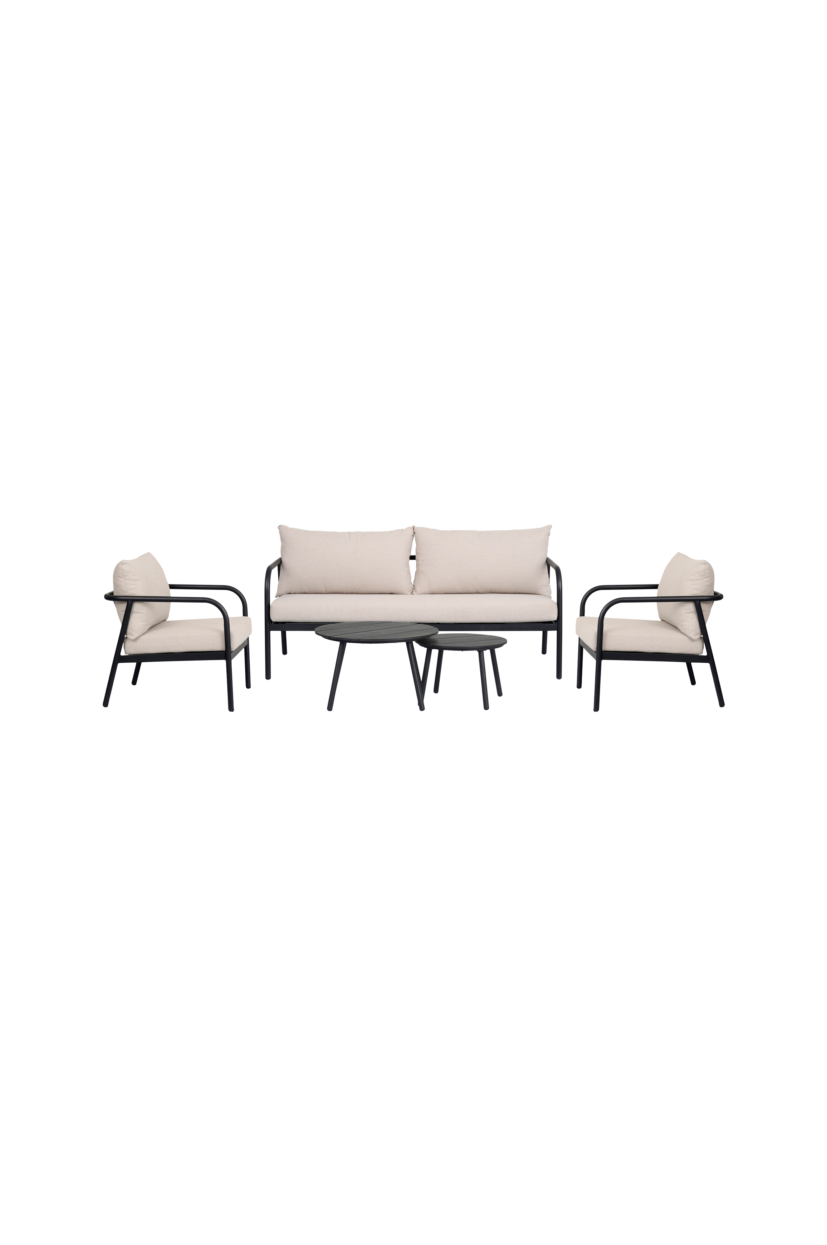 Hagemøbler/loungesett i imponerende, moderne design. Gruppen inkluderer en sofa, et bord og to stoler.