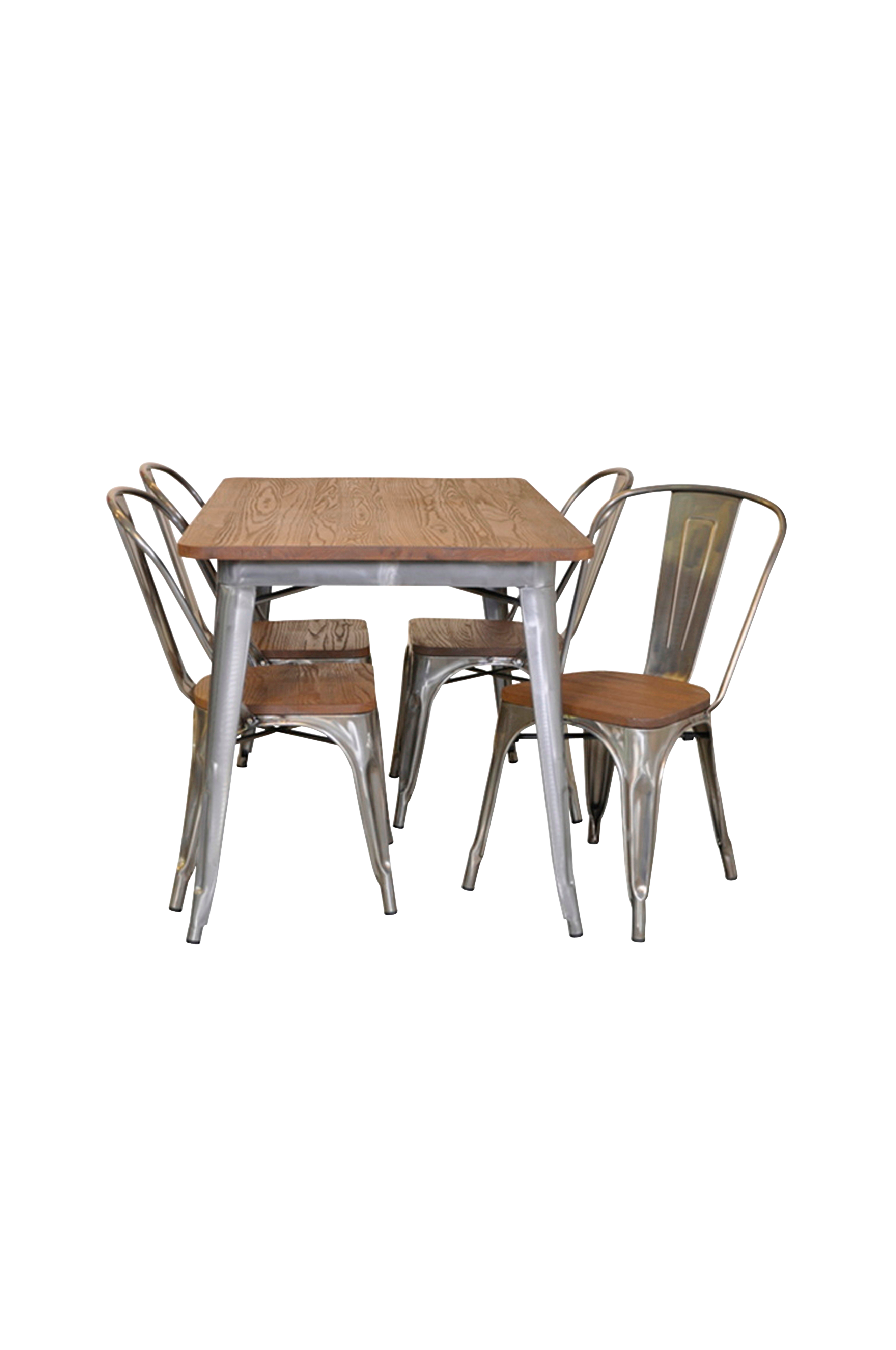 Dette franskinspirerte settet består av et bord med en plate i rustikk, røff farge. Dette inkluderer 4 metallstoler.