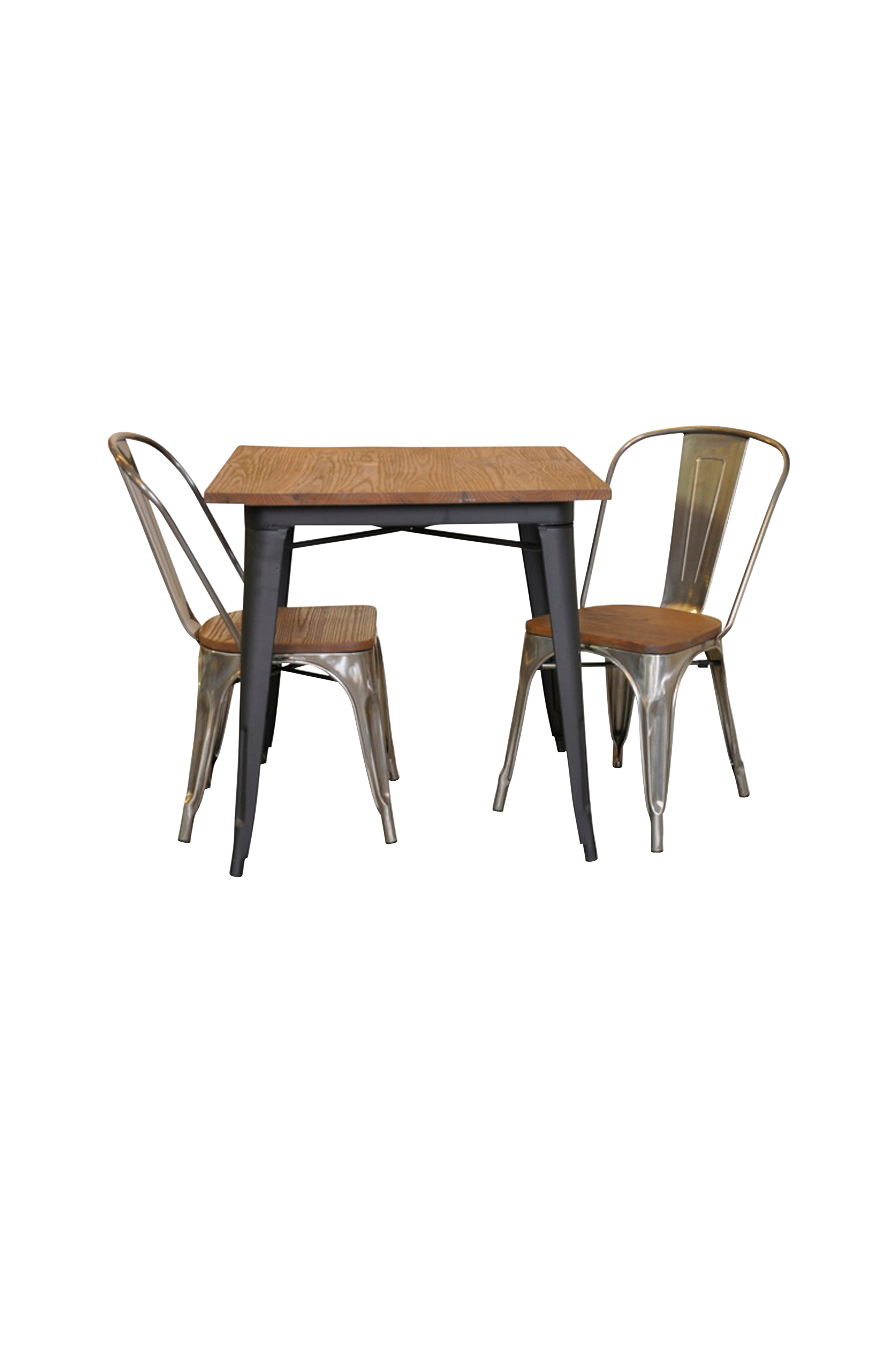 Dette franskinspirerte settet består av et bord med en plate i rustikk, røff farge. Dette inkluderer 2 metallstoler.