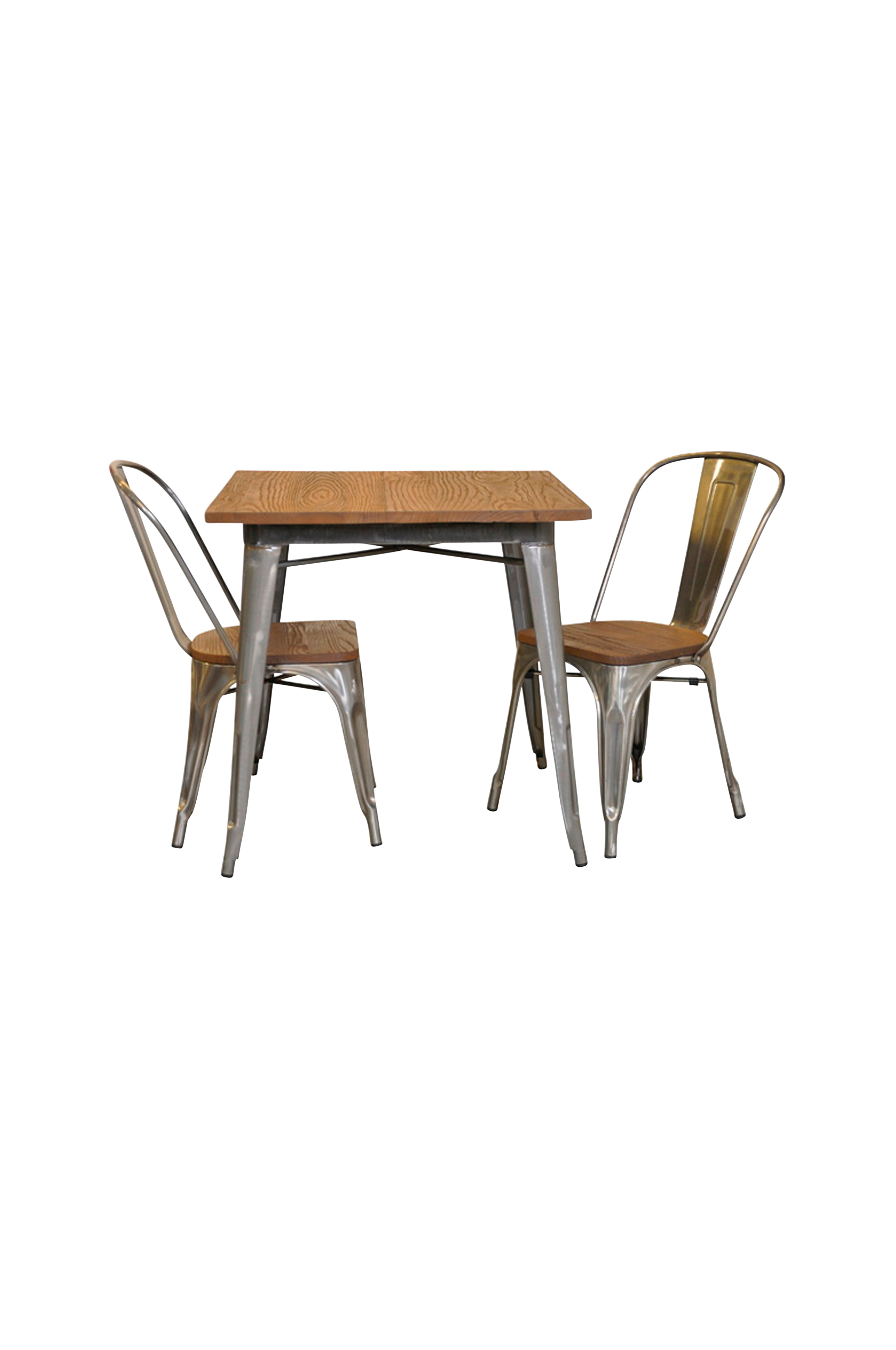 Dette franskinspirerte settet består av et bord med en plate i rustikk, røff farge. Dette inkluderer 2 metallstoler.