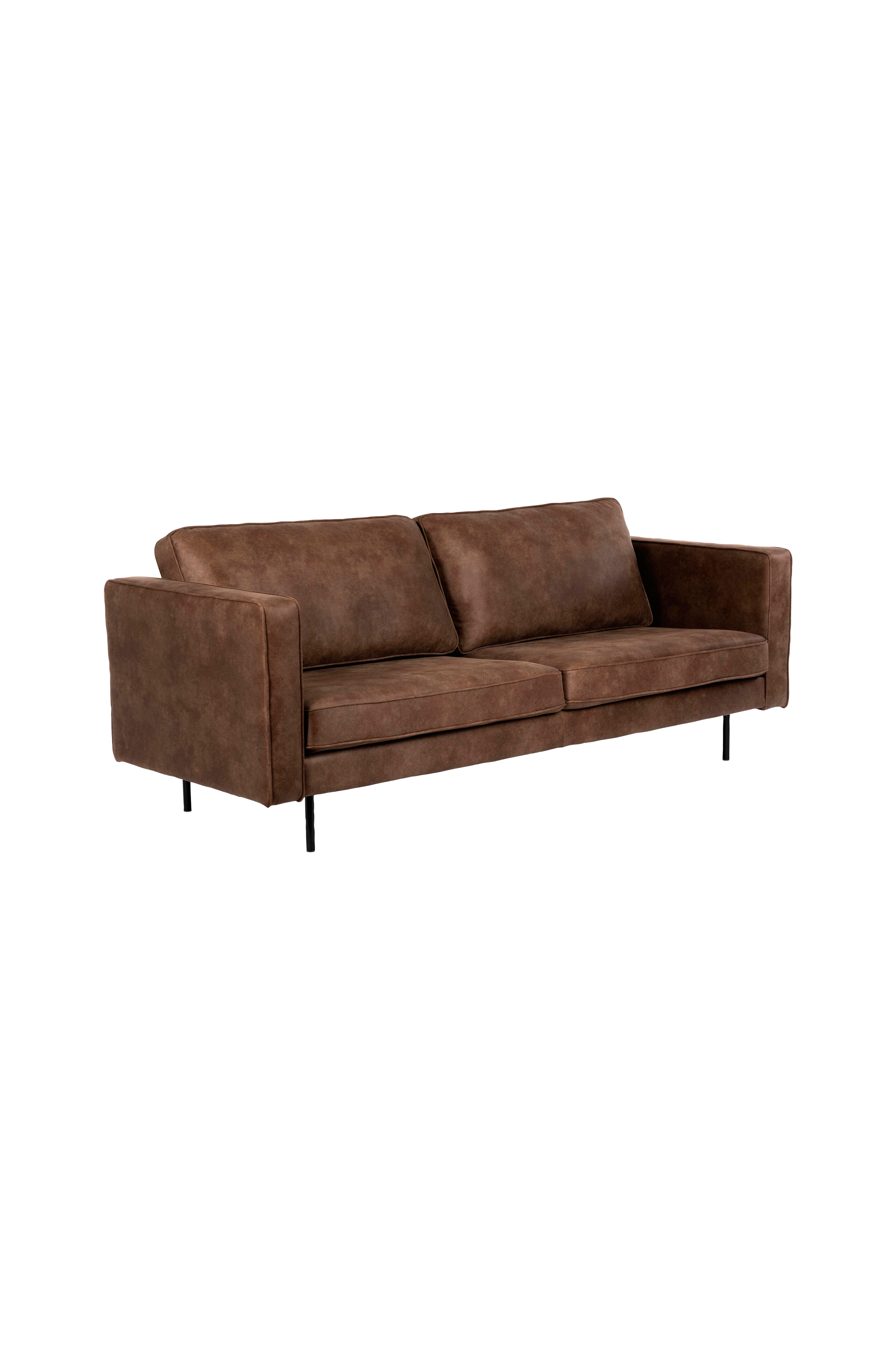 Sofa i et fint mikrofiberstoff. Avtagbare ryggputer med polyesterfiberstopp. Hvis man vil kan ryggputene settes fast med en glidelås. Sete med skum. Metallben.
