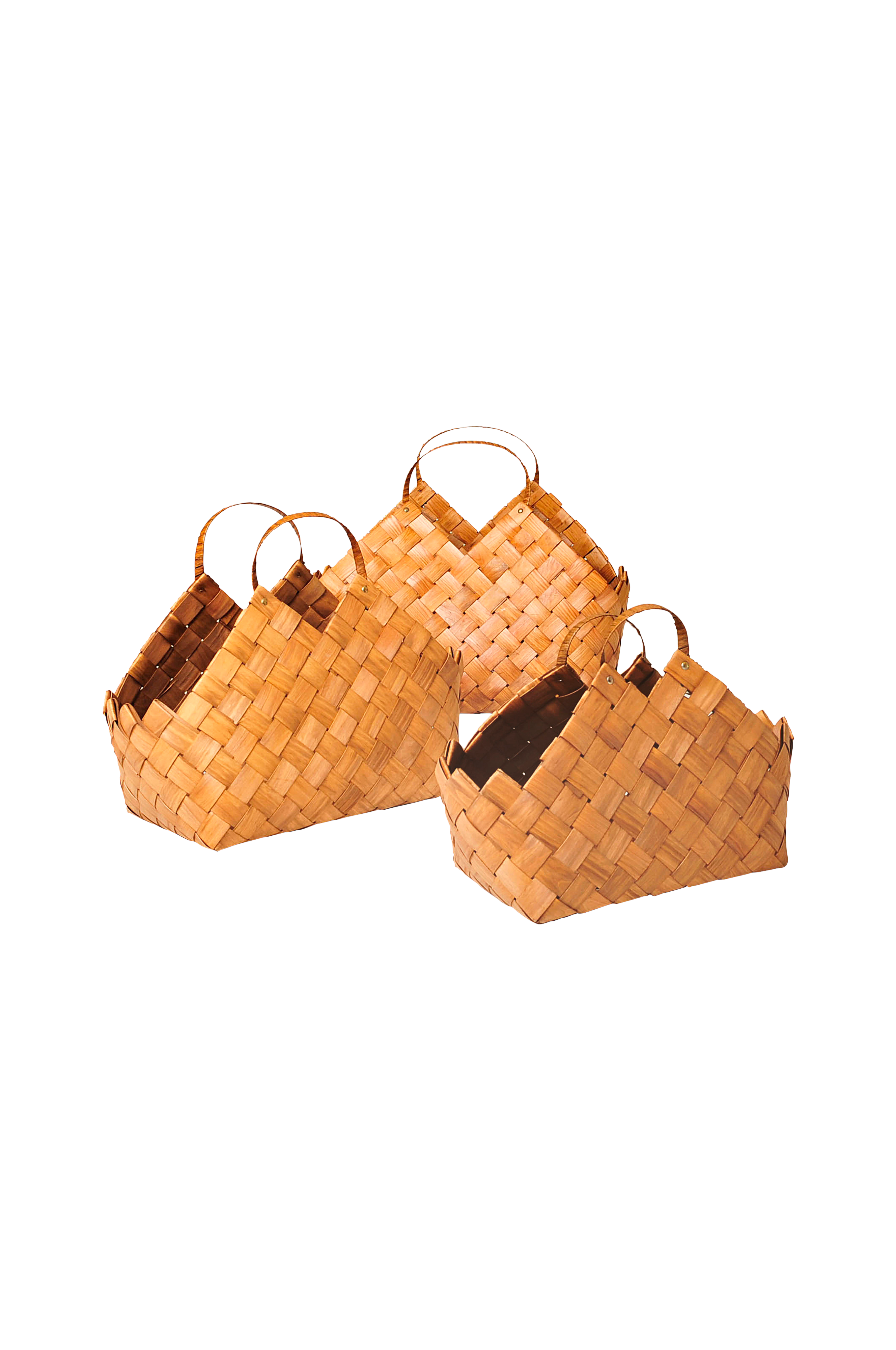 Flettede kurver i 3 deler av sypress. Mål: stor kurv 68x42, høyde 46 cm. Mellomste kurv 55x33, høyde 40 cm. Liten kurv 43x25, høyde 34 cm.