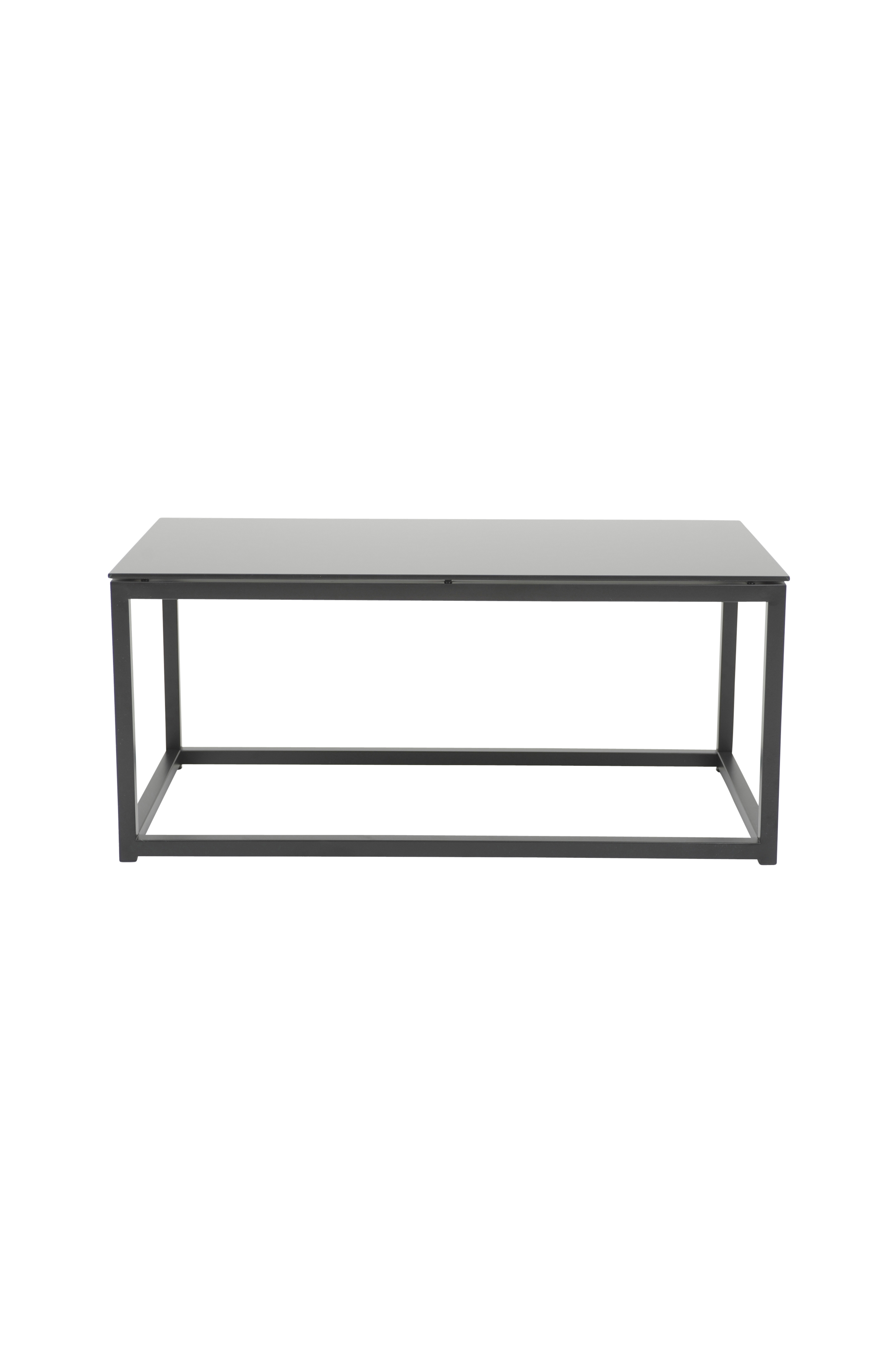 Sofabord i farget glass og understell i lakkert metall. Kan settes sammen til et settbord med sofabord i mindre størrelse.