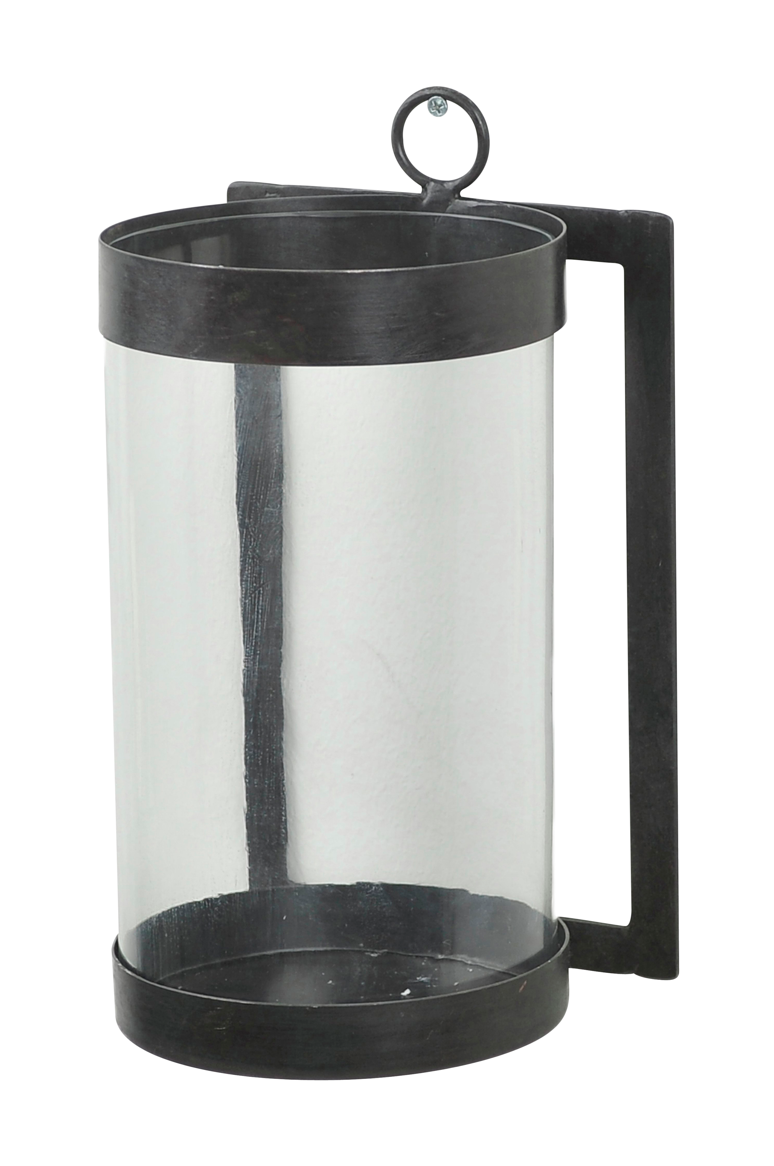 Lykt for vegg. Metall med glassylinder. Antikk finish. Bredde 17 cm, dybde 16 cm og høyde 32 cm. Montert.