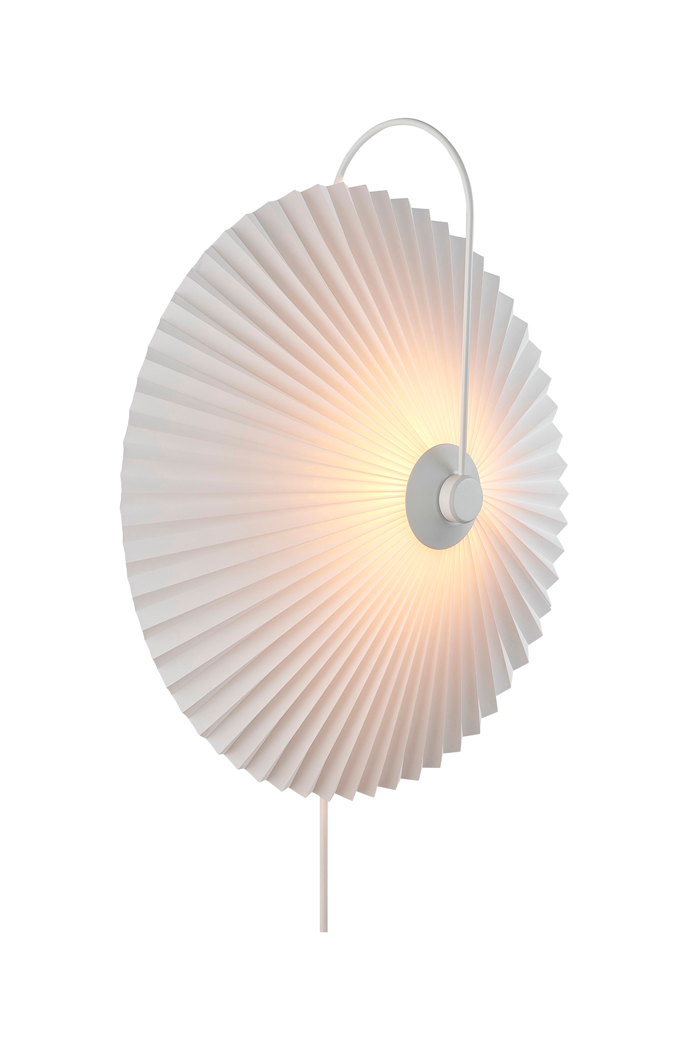 Nadia er en moderne tolkning av en klassisk vegglampe med en plissert skjerm som avgir et mykt, diffust lys. Den buede metallrammen gir et elegant og moderne uttrykk.