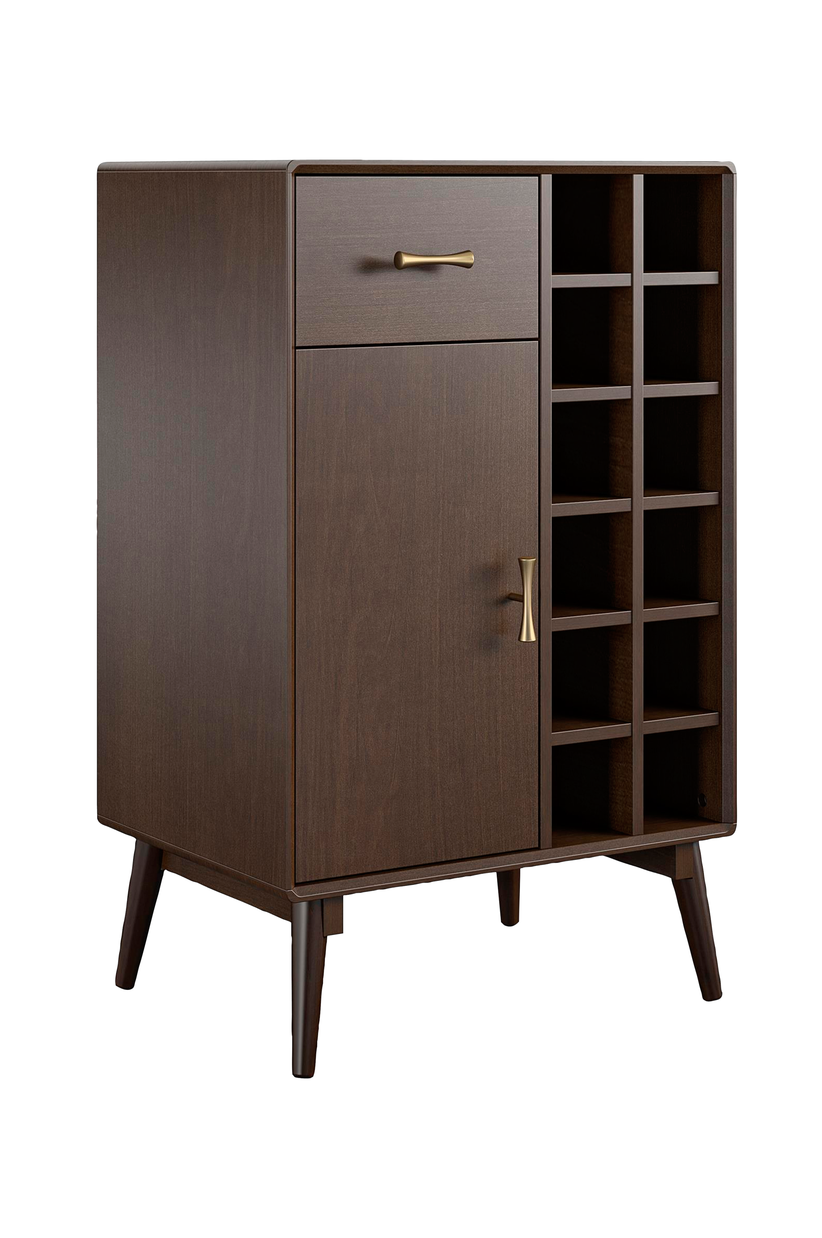 Med barskapet fra Novogratz har du all oppbevaring du trenger for å organisere neste fest. Vakker trefiner med valnøttfinish ser ut og føles som ekte tre og passer perfekt sammen med de vinklede trebena. På skapet kan du sette snacks, drikke og glass slik at gjestene kan forsyne seg. Det er 12 rom til oppbevaring av flasker, og på de to hyllene bak skapdøren kan du sette shakere, karafler og vinglass. Skuffen rommer festtilbehør som bestikk og servietter. Det medfølger et sett for å feste møbelet trygt mot veggen. Barskapet leveres i en flat pakke og må monteres. Vi anbefaler at to voksne monterer produktet. Montert måler barskapet H99 x B61 x D41 cm.