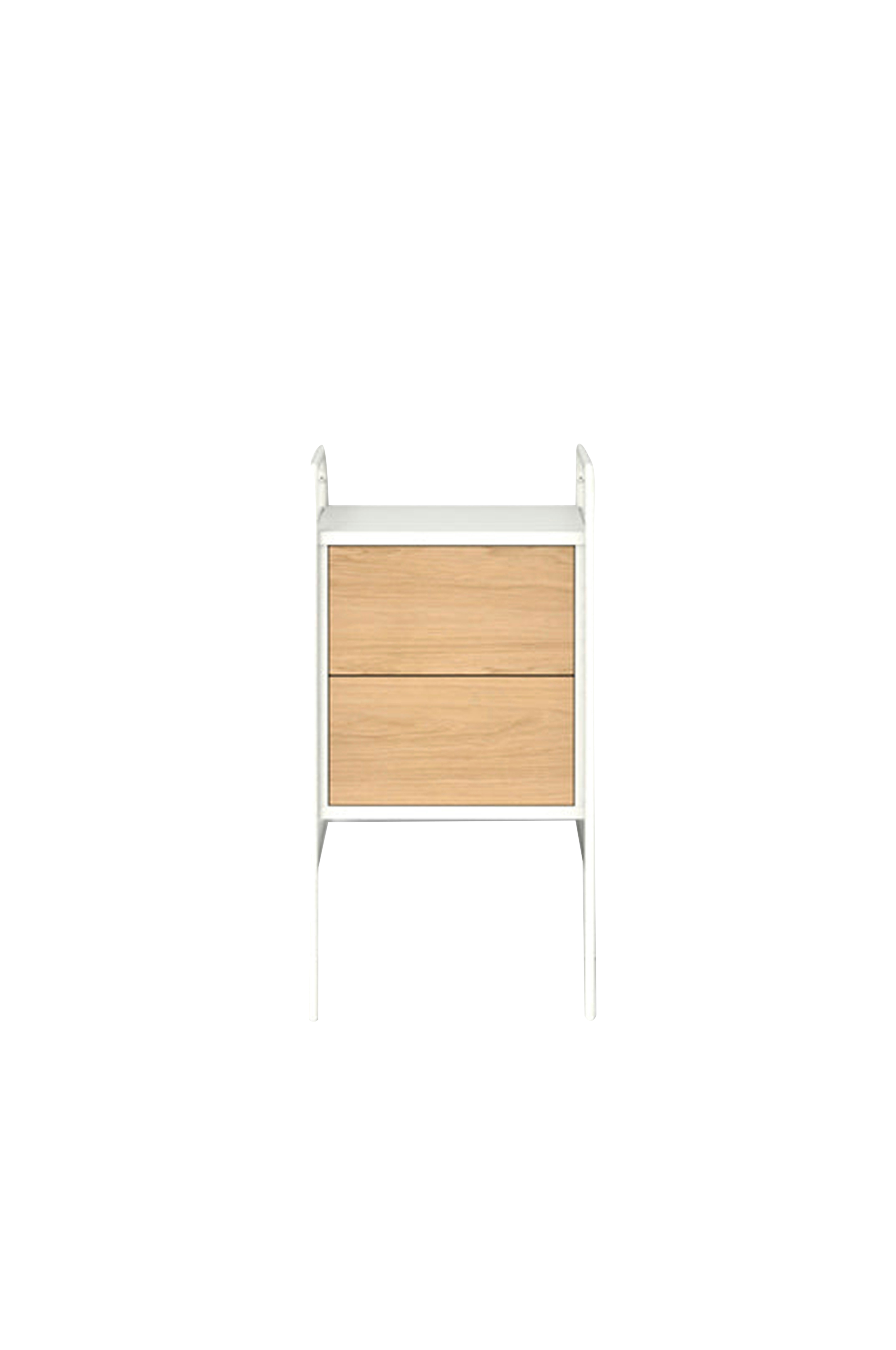 Nattbord med skuffer. Fleksibelt, byggbart og skalerbart hylle- og oppbevaringssystem. Tilgjengelig med en rekke kombinasjoner med ulike funksjon og fargealternativer. Design av Hans Thyge & Co. Trinnene er produsert i vannbasert pulverlakkert metall med justerbar fot. Hylle og stammer i lakkert FSC-sertifisert MDF, dører og skuffefronter i lakkert MDF.