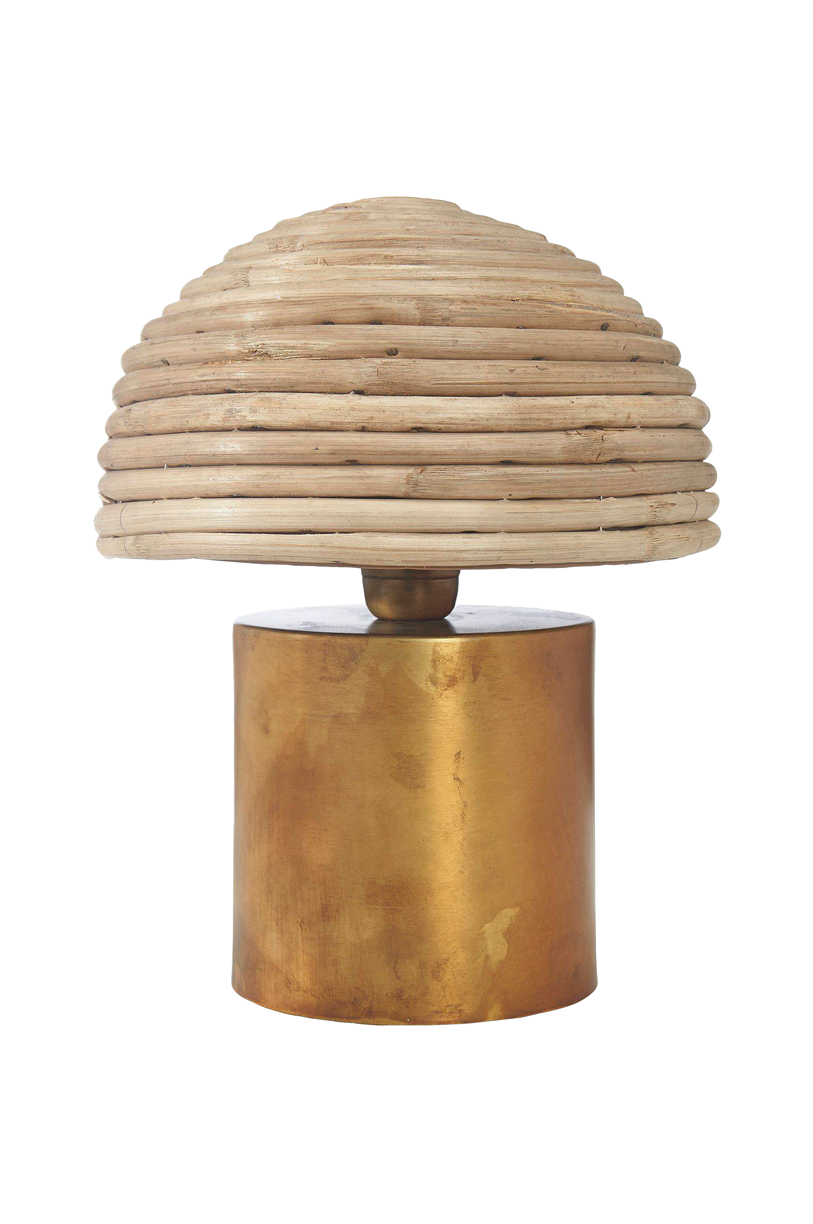 Bordlampe Bess med fot i metall og skjerm av rotting. En sopplignende fasong med en lekker miks av materialer. Finishen på metallet er «brent» messingfarget, og skjermen er naturfarget. Lampen blir et blikkfang og er lettplassert. Lampen er håndlaget. Det gjør at både farge og størrelse på skjermen kan variere noe. Høyde 32 cm, diameter 26 cm. Lampefotens diameter 15 cm. 2 meter lang svart tekstilkledd ledning med strømbryter. E27-sokkel. Maks 25 W. IP20. Lyspære er ikke inkludert. Anbefaler en liten, rund lyskilde med E27-sokkel.