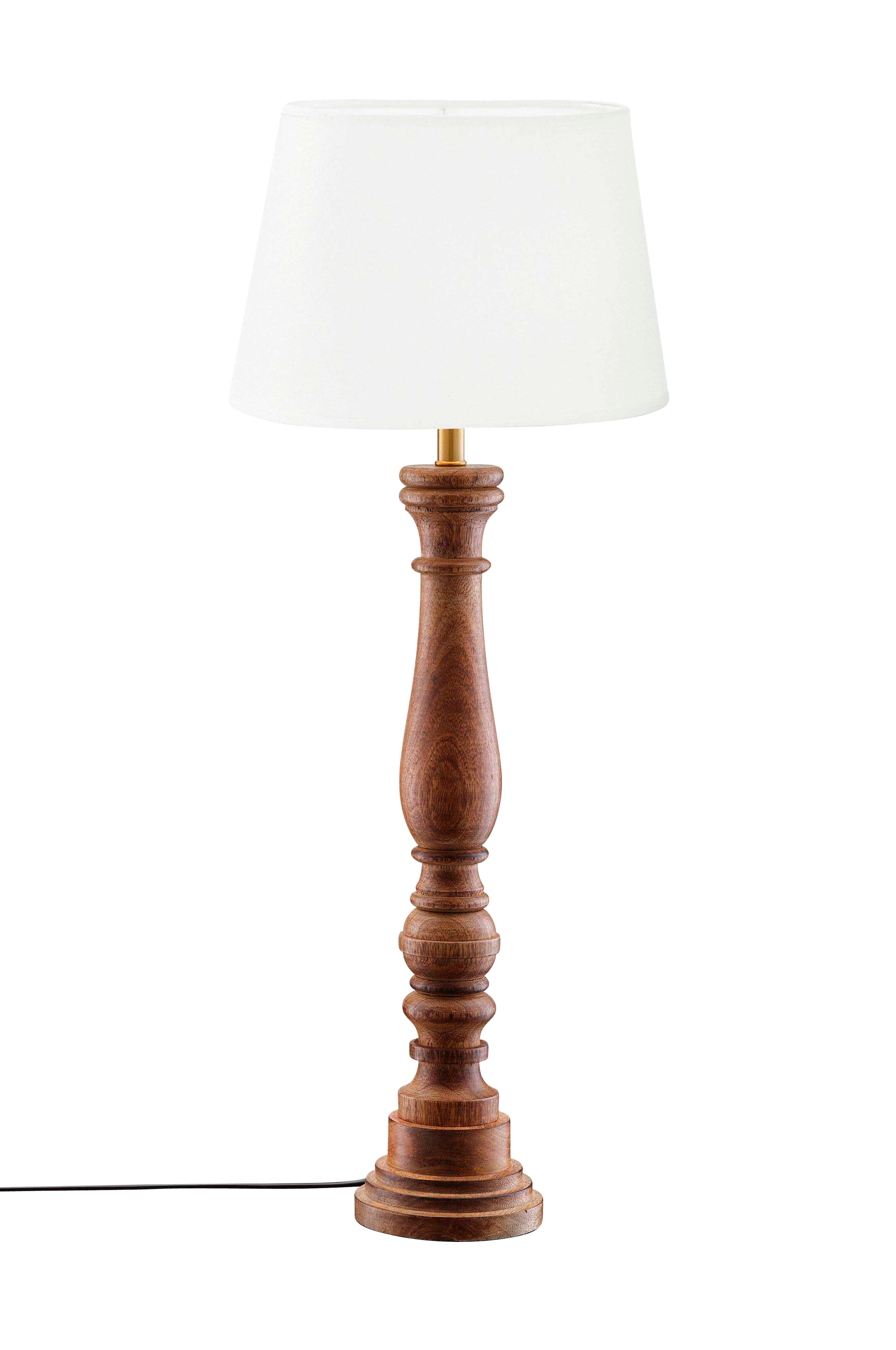 Bordlampe doris i dreid mangotre med oval lampeskjerm omera i hvitt bomullsstoff. Lampeskjermen er 23 cm bred, 15 cm dyp, 16 cm høy og har klofeste. Lampefoten er 53 cm høy, og den totale høyden er 64 cm. 1,4 m svart plastledning med av/på-bryter og flat EU-plugg. E27-sokkel. Maks. 40 W. Ip20. Lyskilde kjøpes separat.