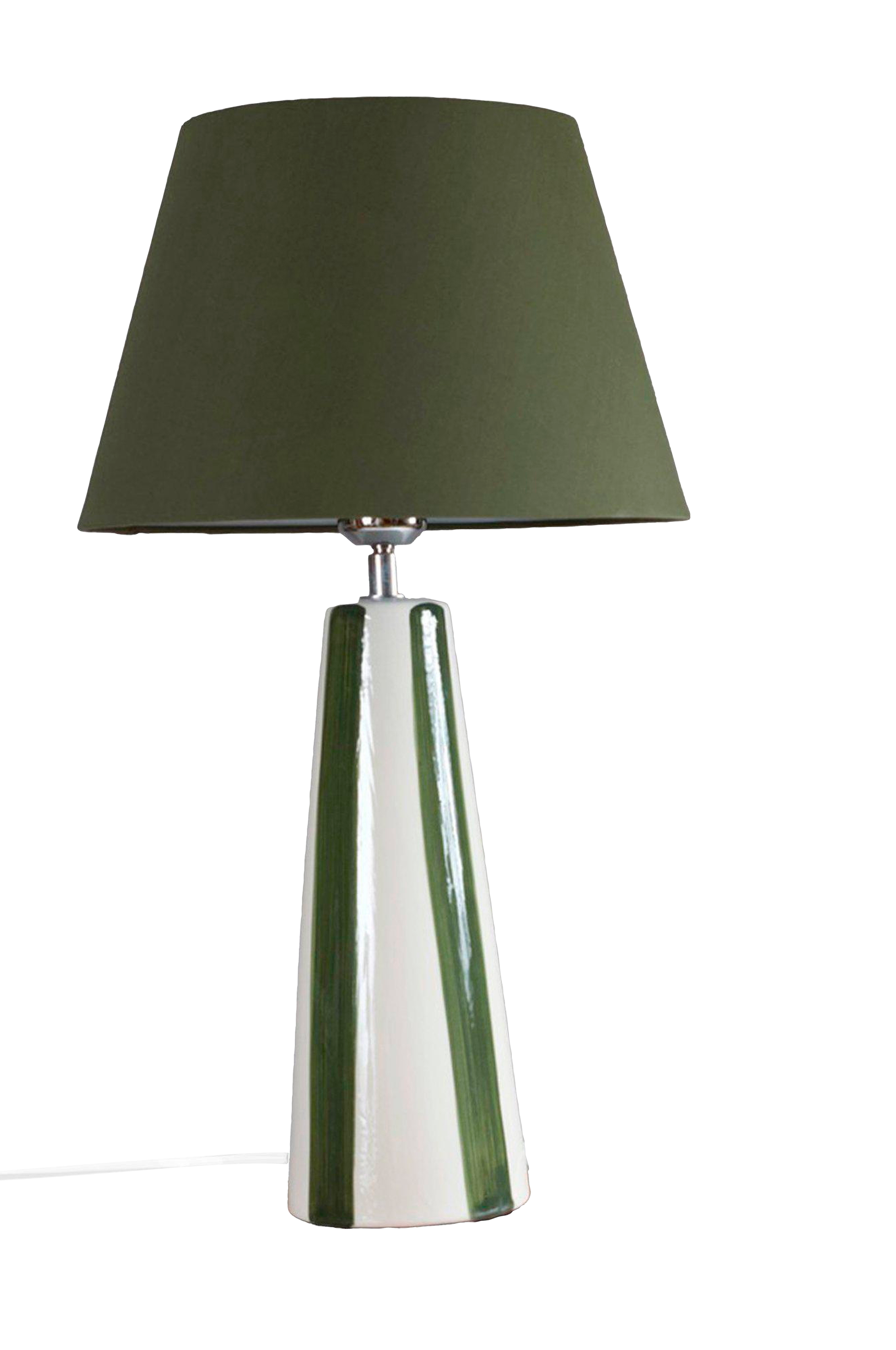 Leya bordlampe er en komplett lampe med matchende skjerm. Den stripete keramikkfoten har et håndmalt uttrykk. Lampens totale høyde er 54 cm, og den måler 30 cm i dybden og bredden. Plastkabelen er 170 cm lang og har en bryter 30 cm fra lampefoten. E27-sokkel. Maks. 40 watt. Ip20. Lyskilde selges separat.