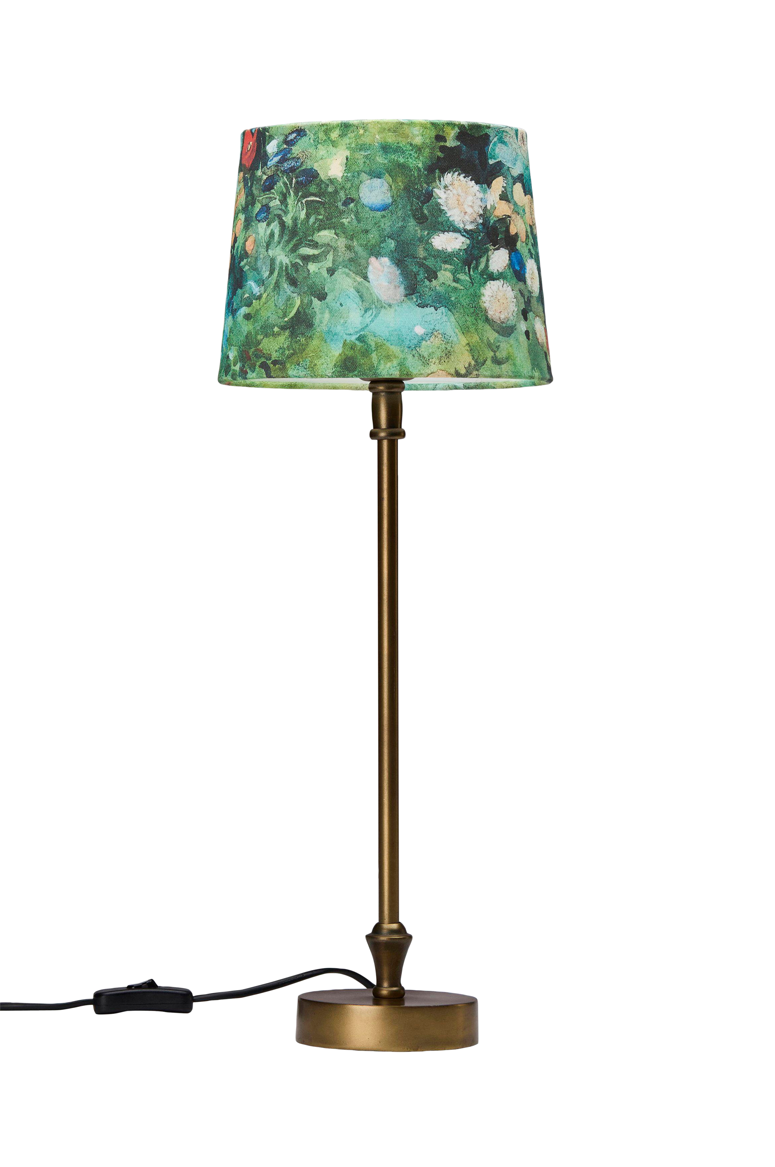 Bordlampe Liam kombinert med lampeskjerm med trykk av kunstneren Carl Larssons malerier. Lys innside og rullede kanter. Formen er lett skrå og har E27-feste. Lampefoten har 1,5 m plastledning med strømbryter ca. 30 cm fra lampen.