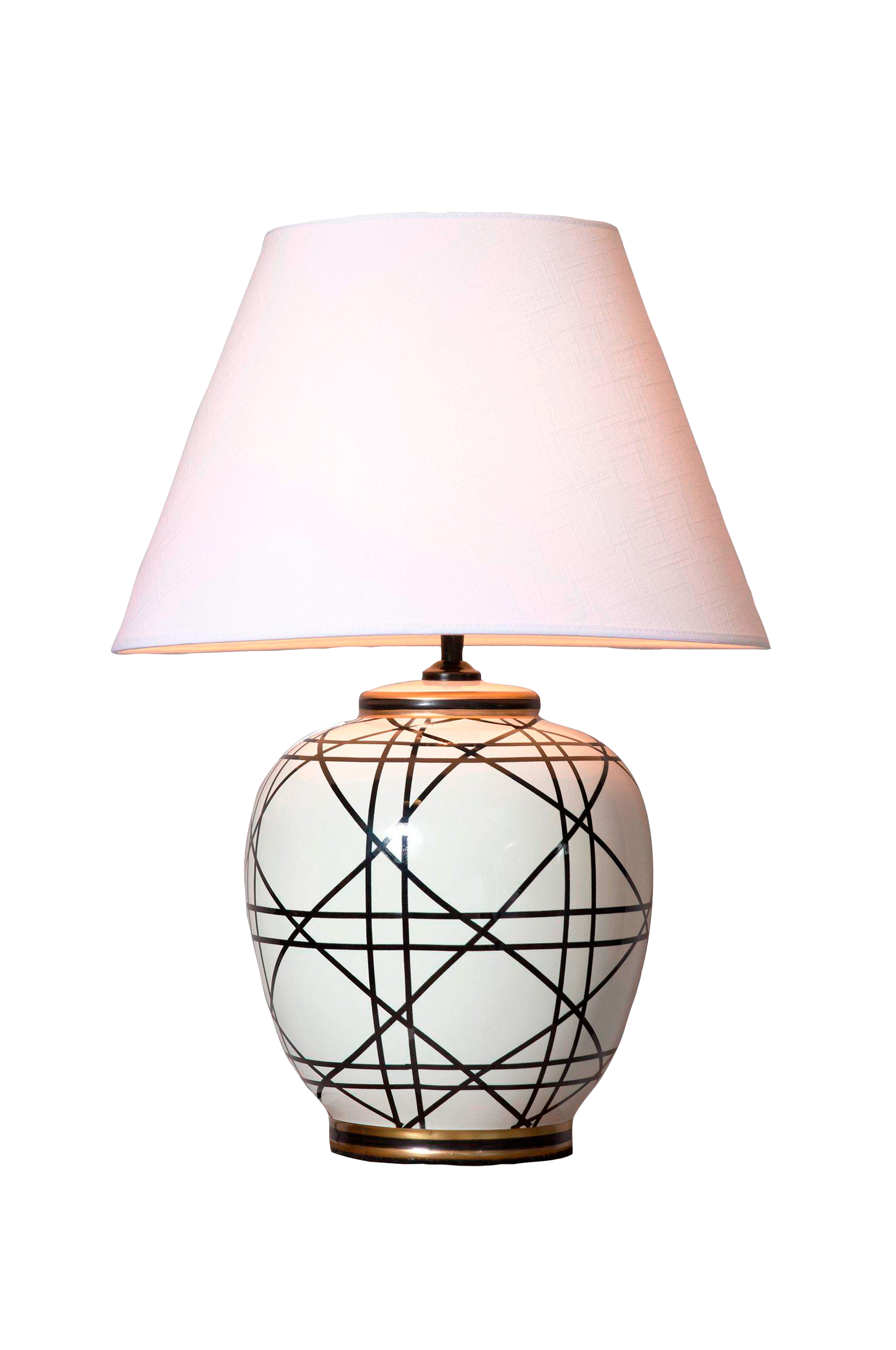 Denne urneformede bordlampen er en ekte statement-lampe som øyeblikkelig fanger blikket. Med sin dristige keramiske base, prydet med et slående grafisk mønster, fungerer den både som lyskilde og dekorativt kunstobjekt. Den karakteristiske silhuetten og den håndtegnede estetikken gir lampen en sterk personlighet - perfekt for deg som ønsker å tilføre interiøret noe dristig og personlig. Lampen måler 60 cm i høyden, og den kjegleformede skjermen er 42 cm bred og 28 cm dyp. Den har en solid, velbalansert fremtoning som gjør den ideell for sidebord, konsoller eller som midtpunkt i en vindusutstilling. Lampen har e27-sokkel (maks. 40 W) og leveres med en 180 cm lang, svart tekstilkabel. Bryteren er plassert 40 cm fra sokkelen for enkel tilgang, og det medfølger en standard EU-plugg. Lyskilden selges separat. Denne keramiske bordlampen er mer enn bare funksjonell - den er et designstatement. En perfekt kombinasjon av grafisk kant og klassisk form som løfter ethvert rom.