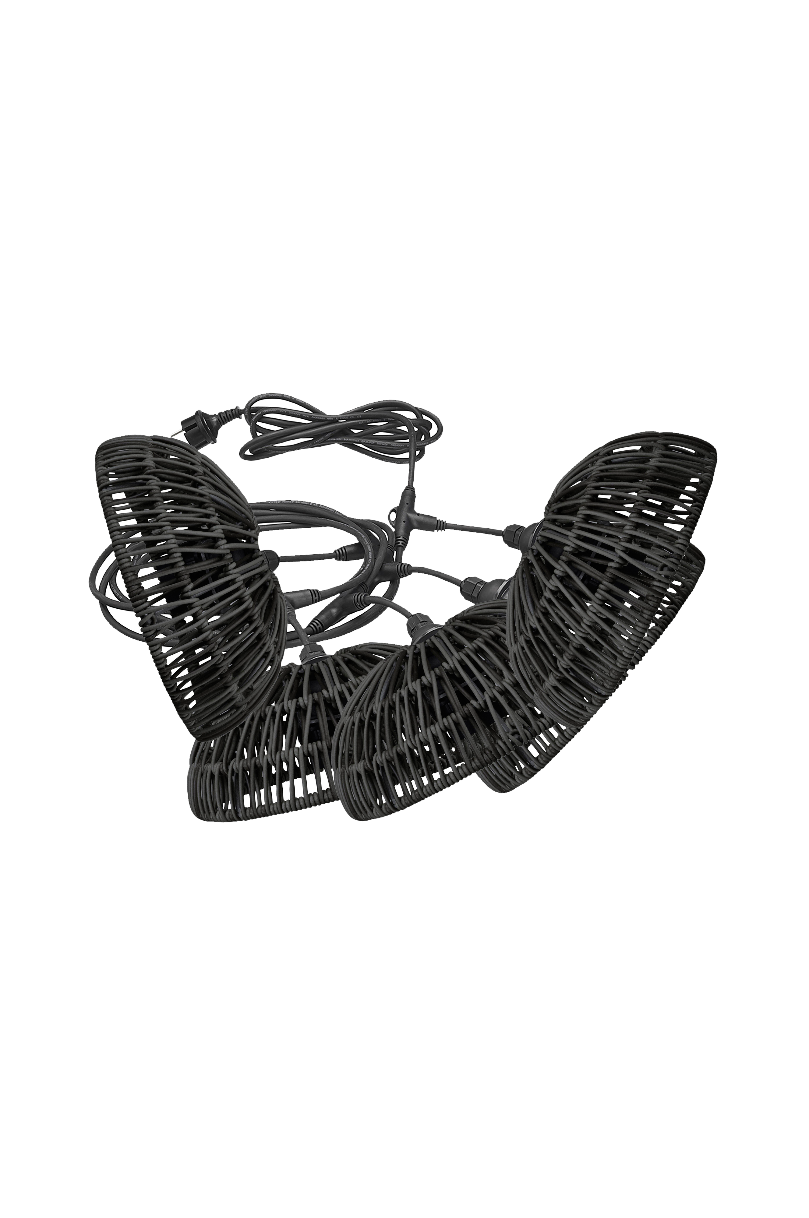 Låt vardagsrummet flytta ut! Flex Out ljusslinga för utomhusbruk (IP44) med 5 st E27 lamphållare (5x15W). Totallängd 6,5 meter, 2,5 meter till första lamphållaren, sedan 80 cm mellan varje lamphållare. 15 cm från T-koppling ner till skärmring. Matchat med 5 st Hue lampskärm i färgat konstrotting. Ljuskällor för utomhusbruk ingår ej. Skärmen är 20 cm bred och 8 cm hög.