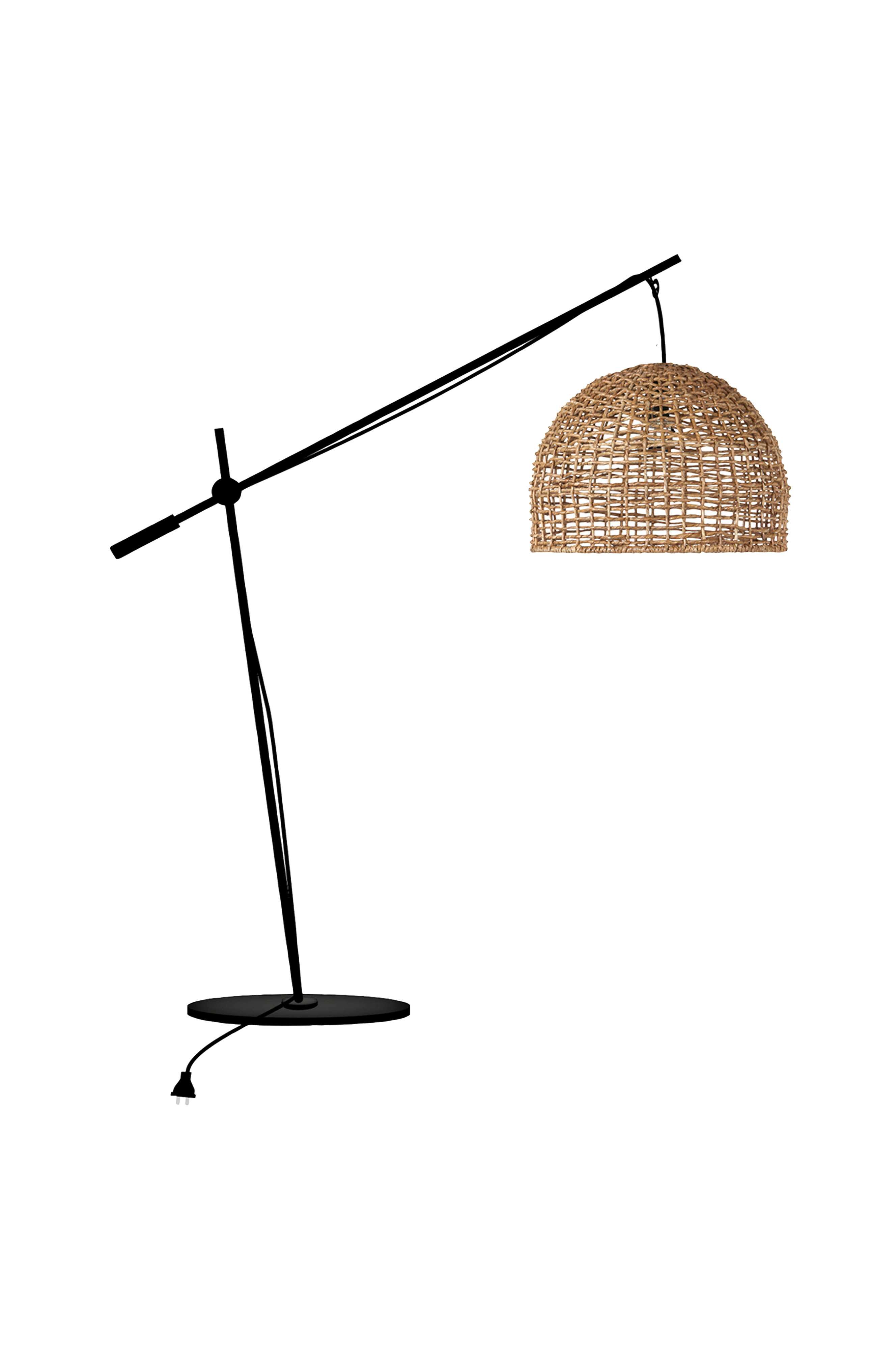 Komplett gulvlampe med cebu-lampeskjerm hengende på et solid stativ og med e27-lampeoppheng egnet for utendørs bruk. Bommen kan justeres i lengderetningen, men høyden på bomfestet er fast. Gulvstativet leveres med 12 klips som brukes til å feste den fleksible kabelen som følger med i pakken. Ca. 2 m kabel vil være igjen fra lampens base.