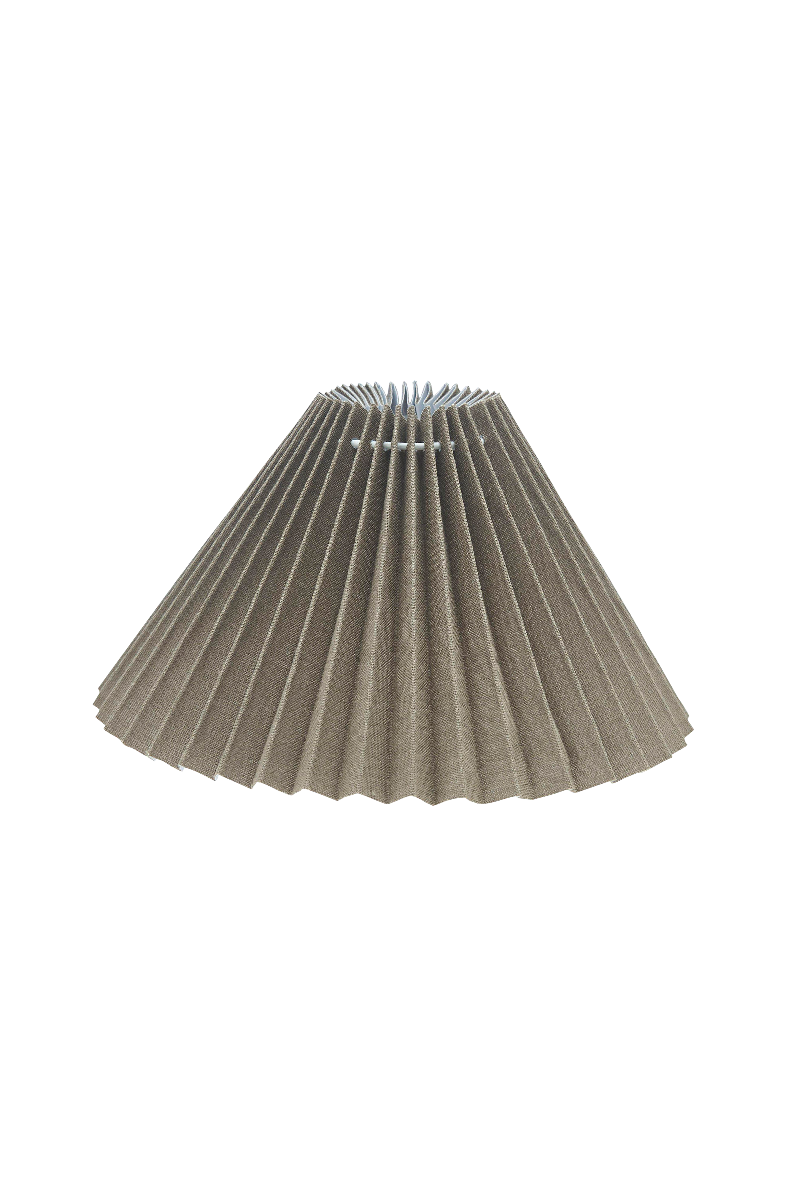 Astrid foldet skjerm i stoff med lintekstur. Skjermen har en solid laminert lys innside som gir et vakkert lysskinn. Skjermen har E27-ringfeste. Mål fra bunn til feste 3,5 cm. Lyspære E27 kjøpes separat. Mål: Høyde 11 cm, bredde 20/6 cm.
