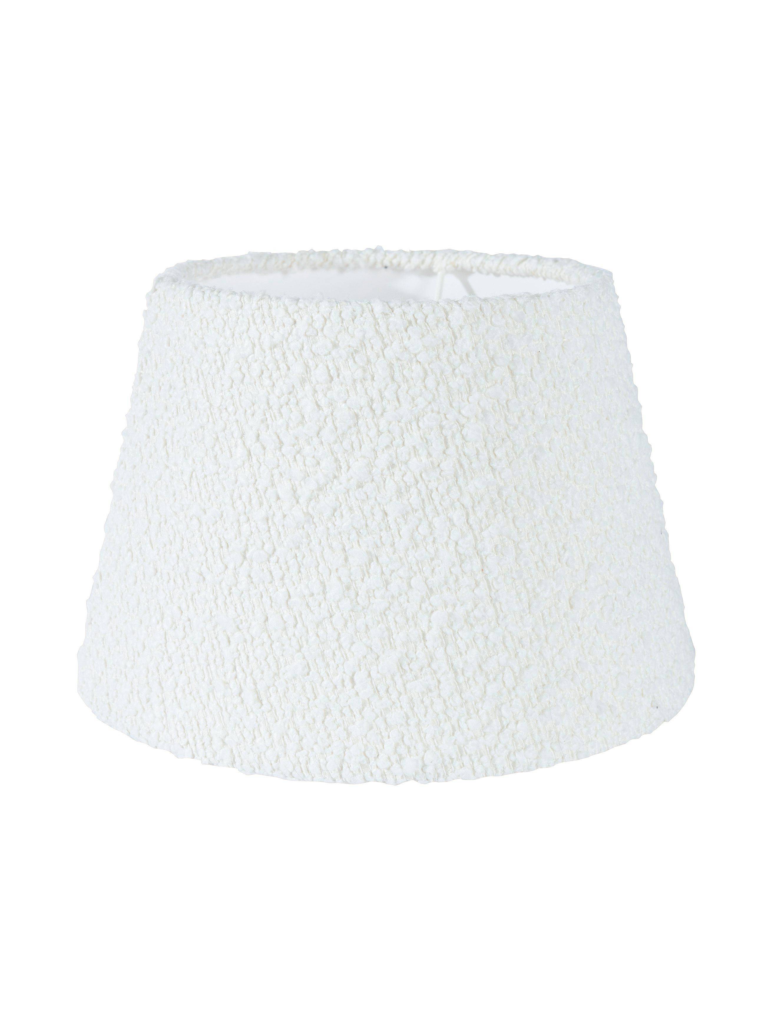 Hanna lampeskjerm har rullede kanter og innbrettet skjøt som skaper en luksuriøs følelse av praktfullt håndverk. Formen er lett skrånende og har hvit laminat som gir et fint lysskinn når lampen er tent. Skjermen har E27-ringfeste som sitter ca. 4,5 cm fra bunnen. Høyde 17 cm, bredde nederst 26 cm, bredde øverst 18 cm.