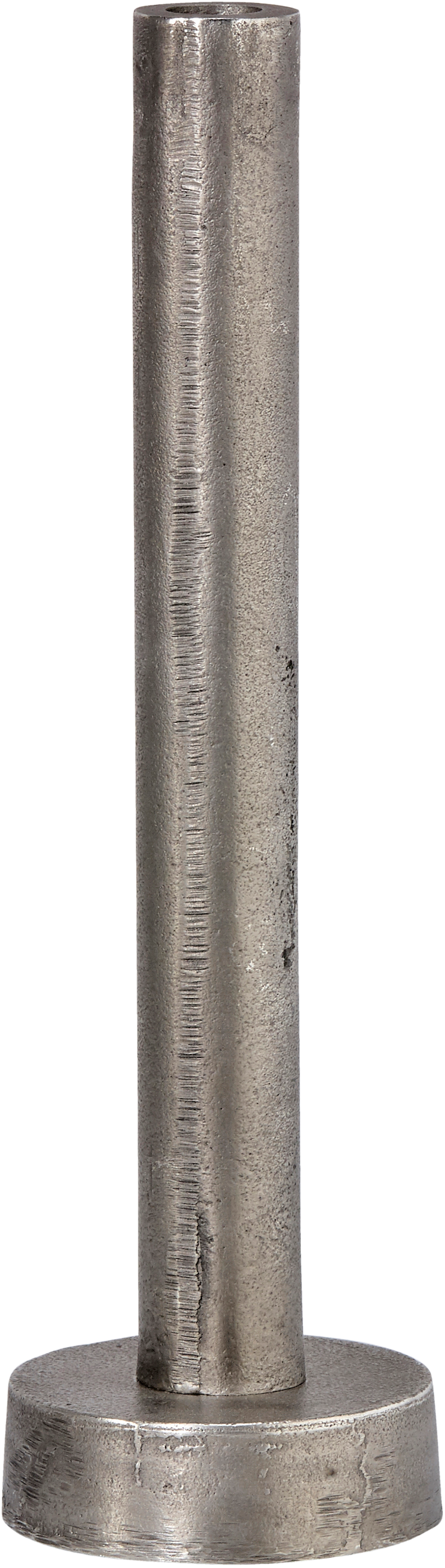 Lysestake Notice i røft metall. Høyde 21 cm. Diameter 10 cm. For kronelys.
