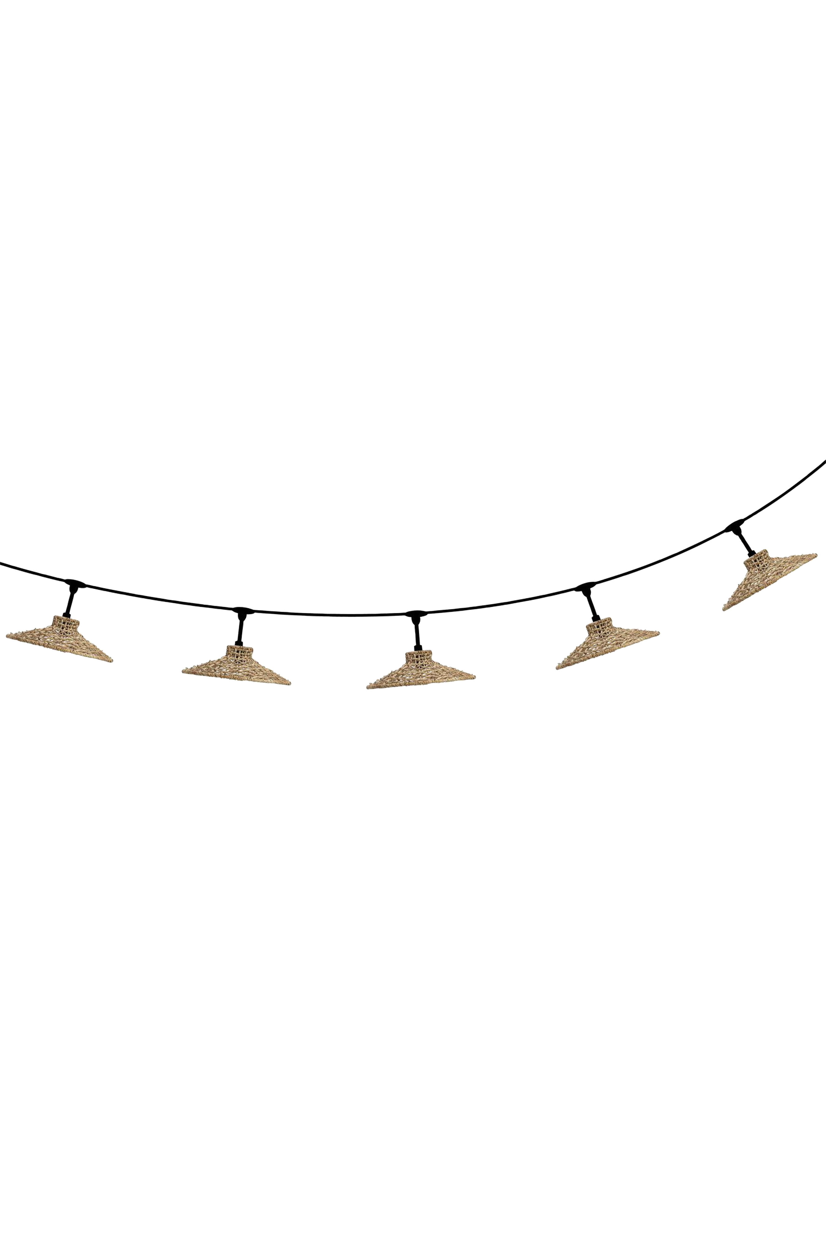 Flex out lyskæde til utendørs bruk (ip44) med 5xe27 fatning. Totalt: 6,5 m. 2,5 m til første fatning og deretter 80 cm mellom. Med 5 lampeskjermer i sari. Fordi det er et naturmateriale, er det best å bruke under tak, i et lukket rom eller innendørs. Ved bruk utendørs vil materialet forandre seg med patina. Skyggen er 29 cm bred og 9 cm høy.