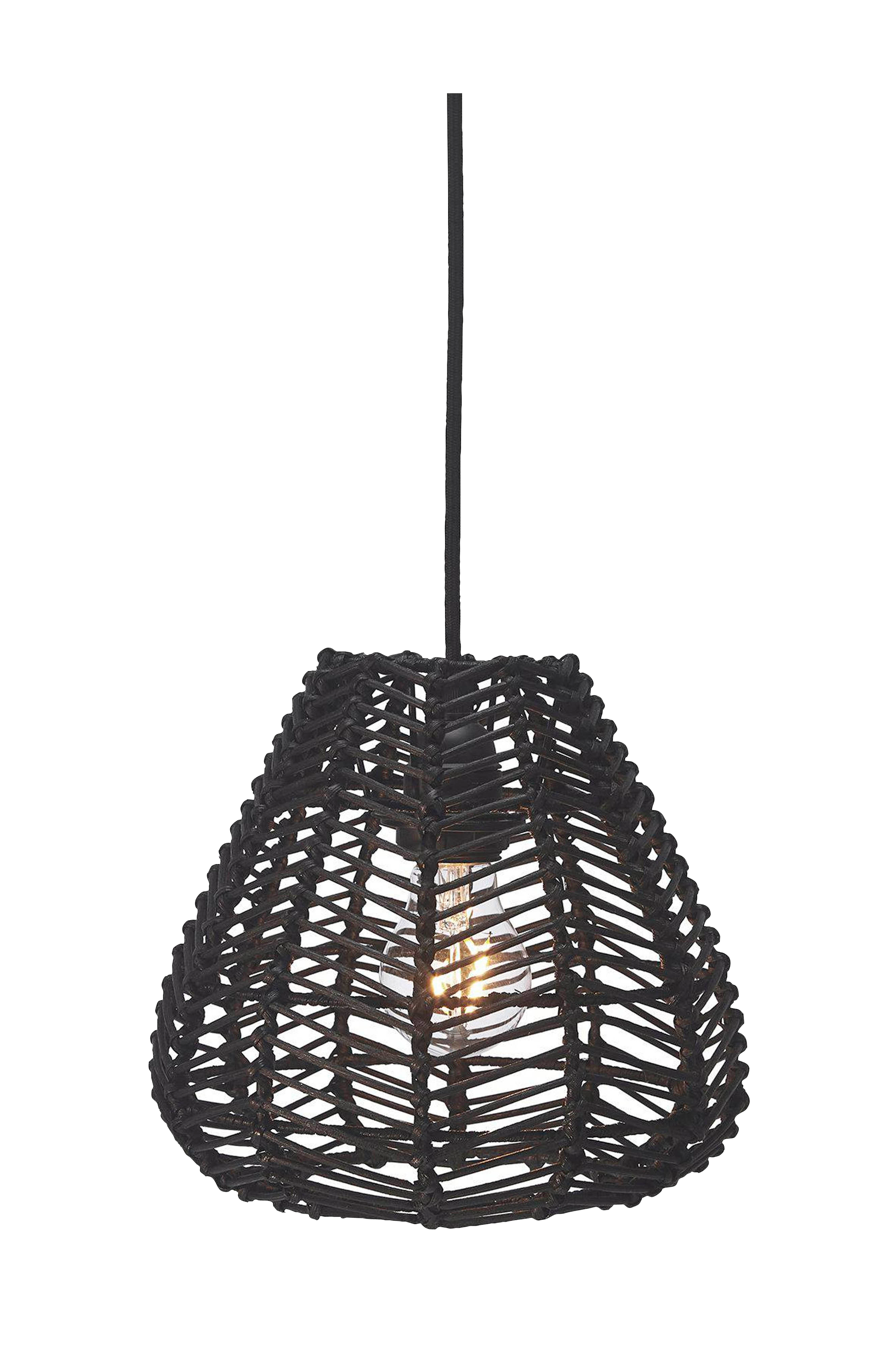 Adelle taklampe i håndflettet svart naturrotting. Skjermen har en behagelig avrundet form, og de vakkert tvinnede detaljene gjør hver skjerm unik. Fordi den er produsert i naturmateriale kan det være små forskjeller i størrelsen, samt at fargen kan forandres over tid. Diameter 24 cm, høyde 25 cm. Svart takoppheng med takkopp for innendørs bruk inkludert, ledningen er 1,2 meter lang og har E27 feste. Bruk lyskilde E27 maks 40W. Lyspære og takkontakt kjøpes separat.