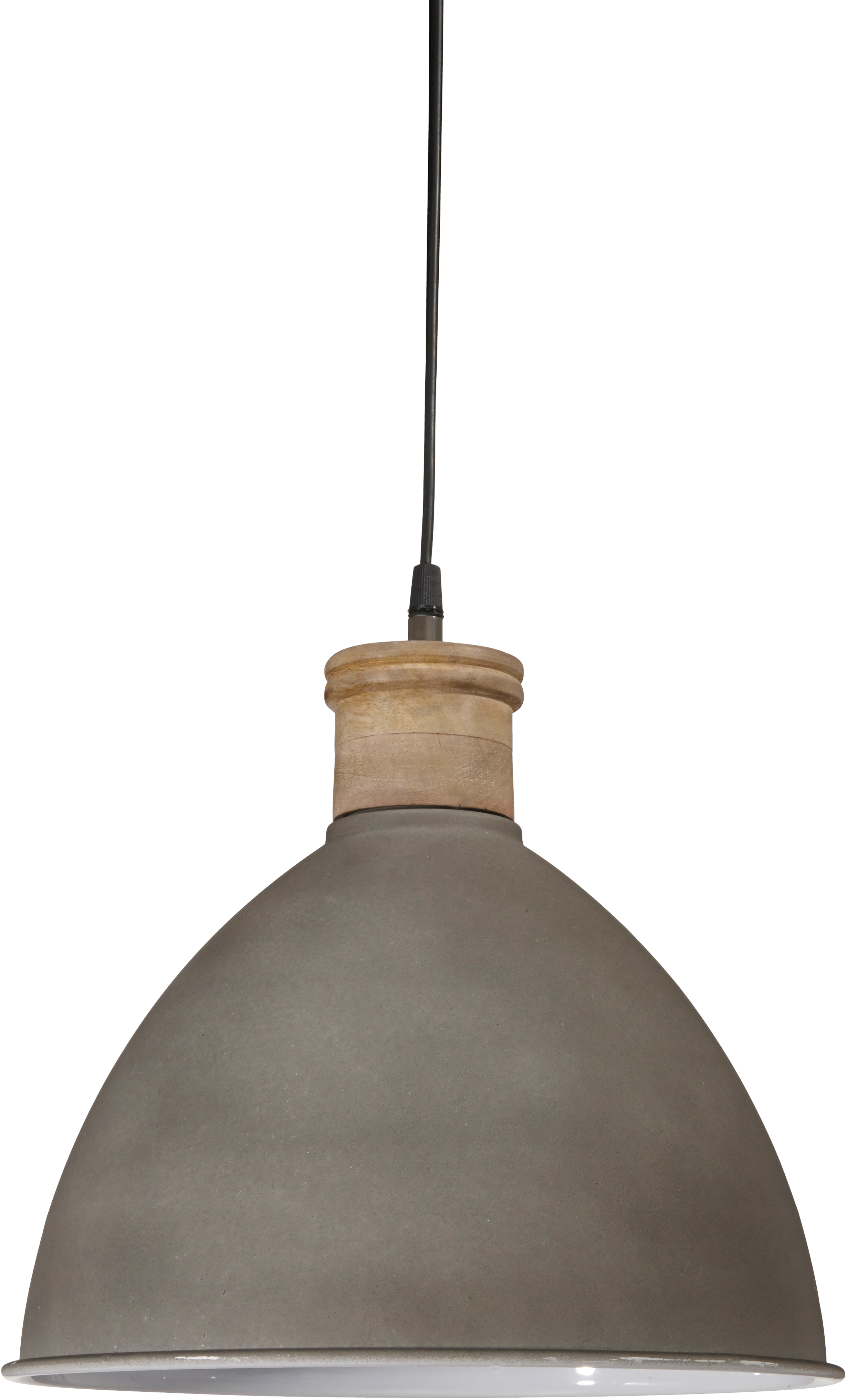 Taklampe i metall med tredetalj, komplett med kronkontakt. Takkopp i samme farge som lampen. 32 cm i diameter, høyde 31 cm. Ledningslengde 120 cm. E27 maks 40w.