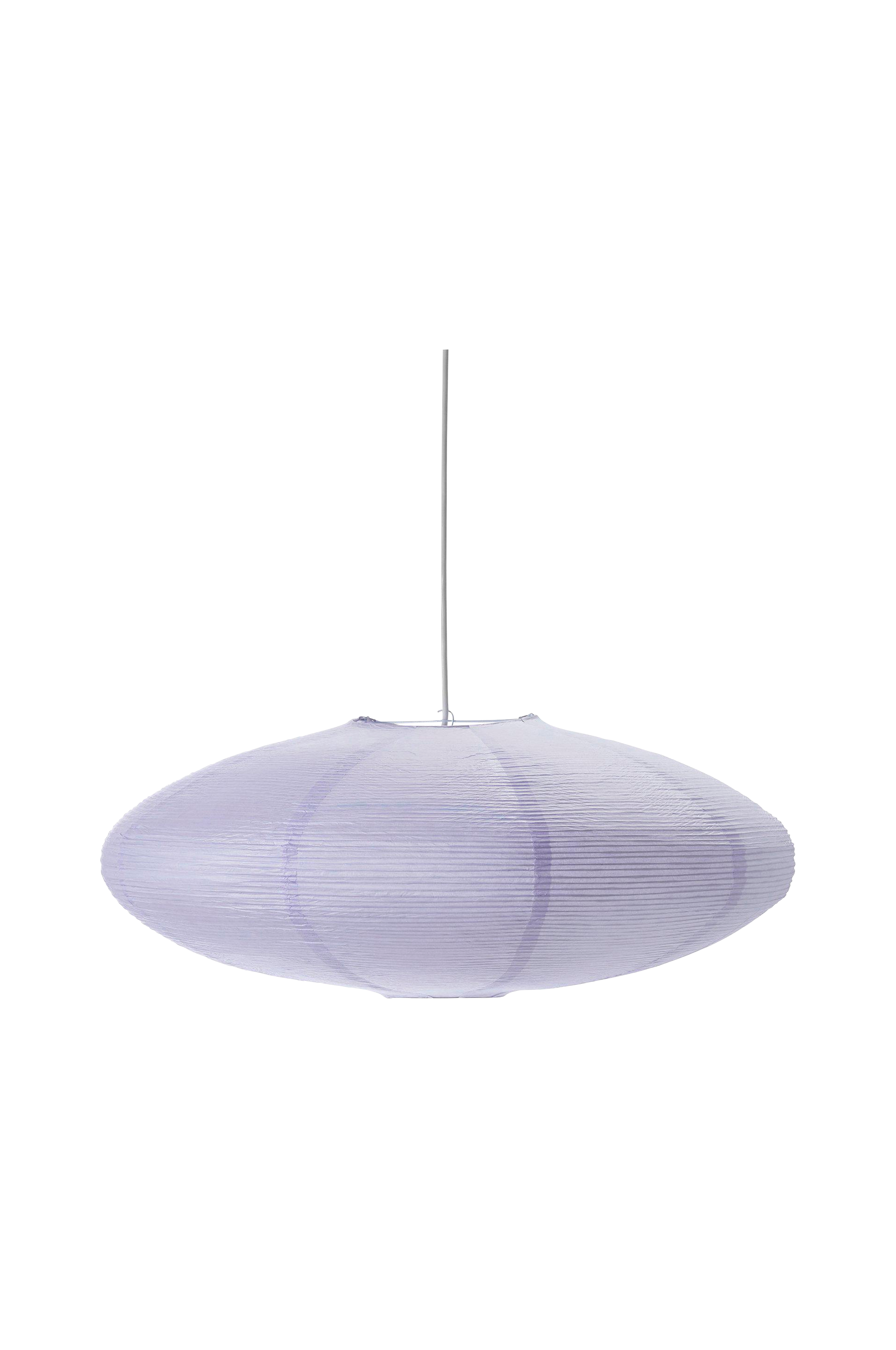 Rispapirskjerm Yuni med tett, uregelmessig metalltråd som skaper et vakkert mønster. Yuni er ellipseformet, 60 cm i diameter og 23 cm høy. Spennes ut ved hjelp av en metallekspander som man også fester lampeledningen i. Takkontakt og lampeledning medfølger ikke. Både takkontakt og lampeledning kan kjøpes separat. Ikke jordet.