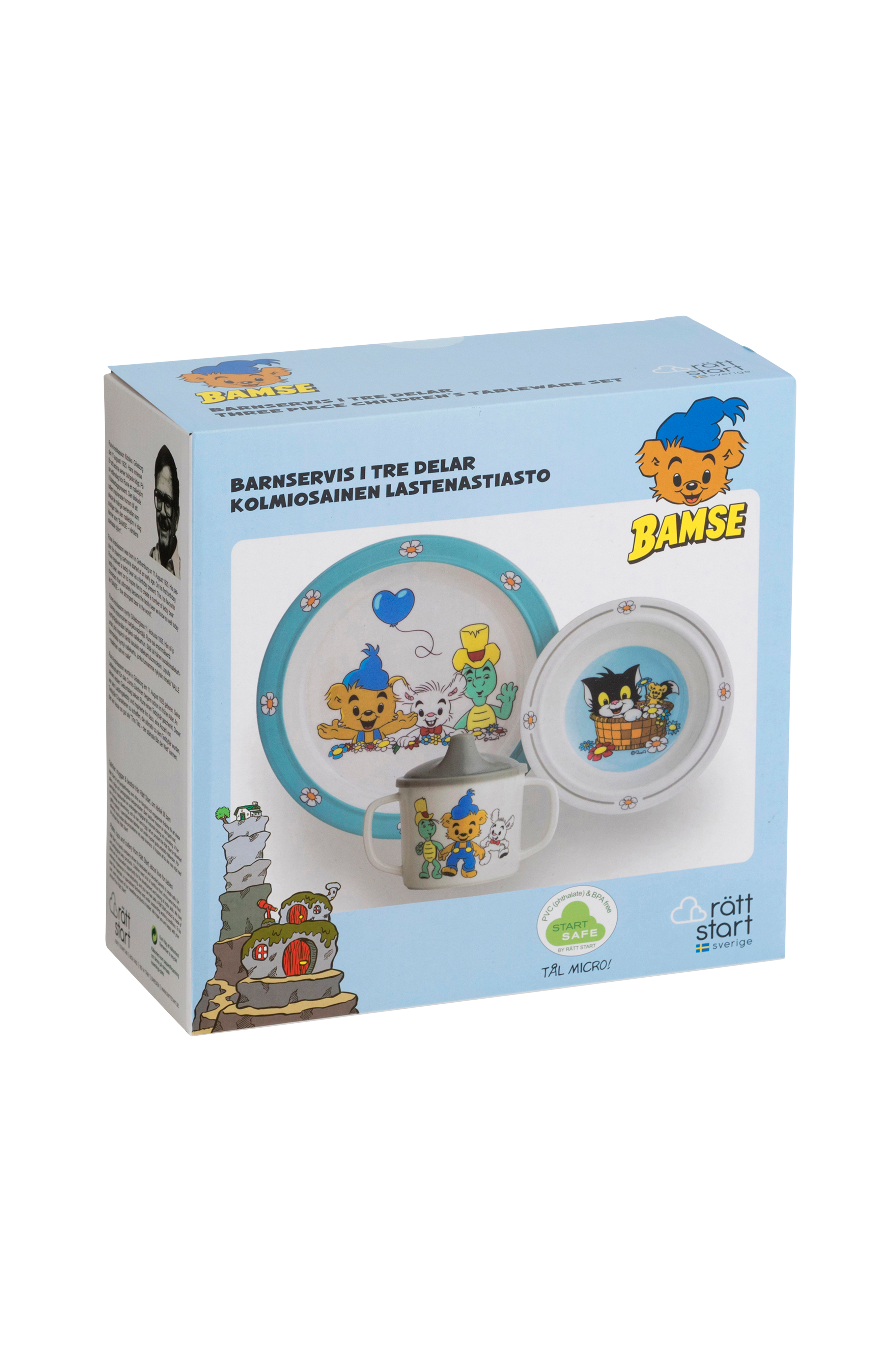Robust barneservise i ripesikker melaminplast med motiv av Bamse. Praktisk antiskliring under koppen og den flate tallerkenen. Dyp tallerken med sugekopp, og dryppsikker kopp med håndtak.