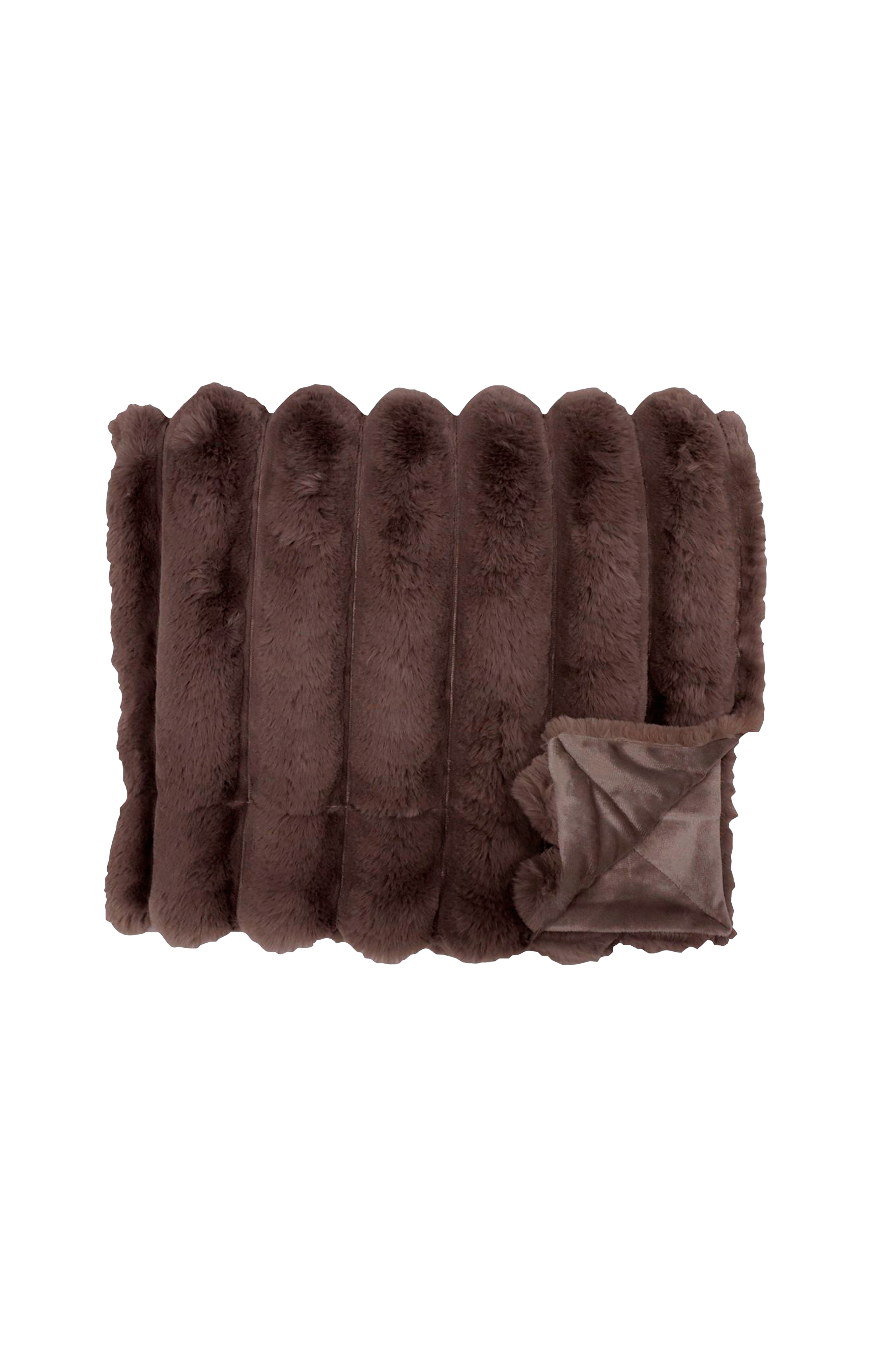 Luksuriøst teppe med ekstra myk fuskepels i brede striper på forsiden. Baksiden er av mykt mikromink-stoff.
