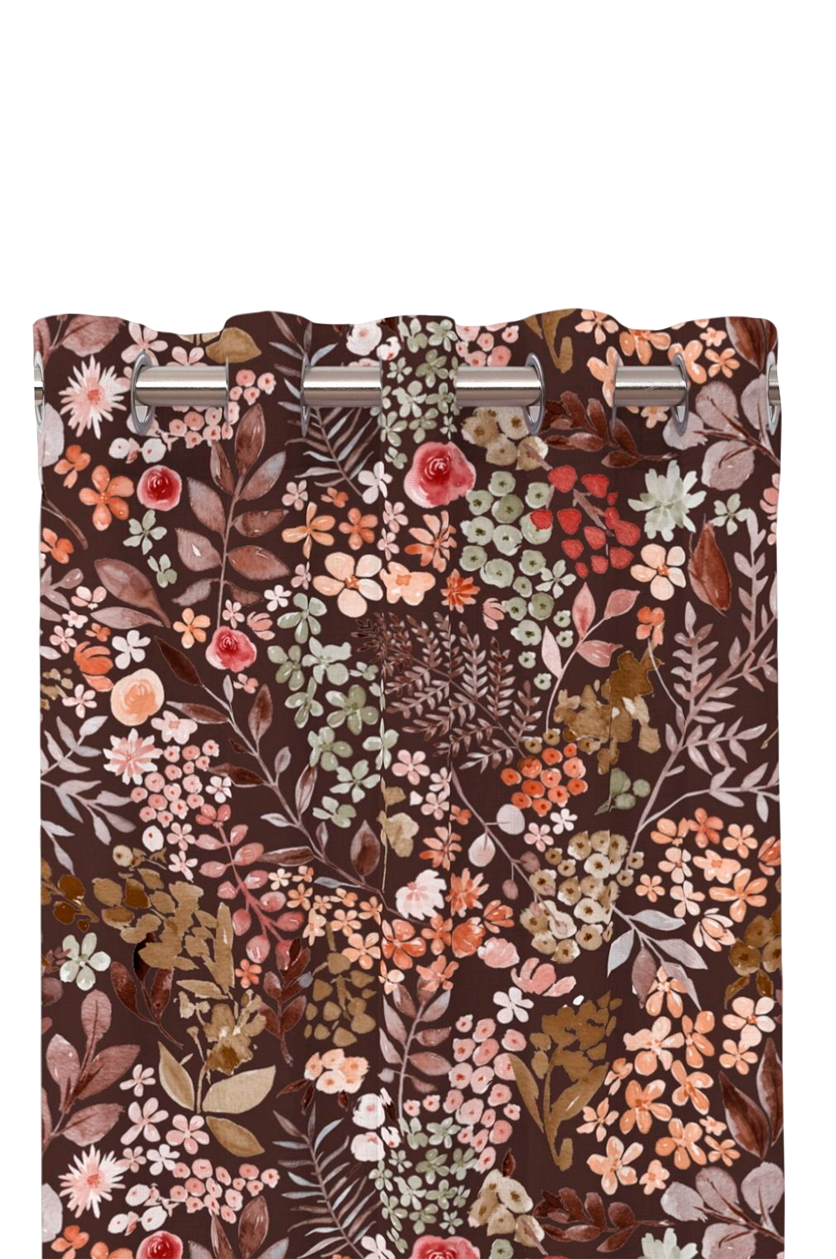 Ferdige gardiner med øyeletter og et nydelig blomstermønster. Trykt på vårt stoff av paris-kvalitet med slub-effekt og overlocket kant.