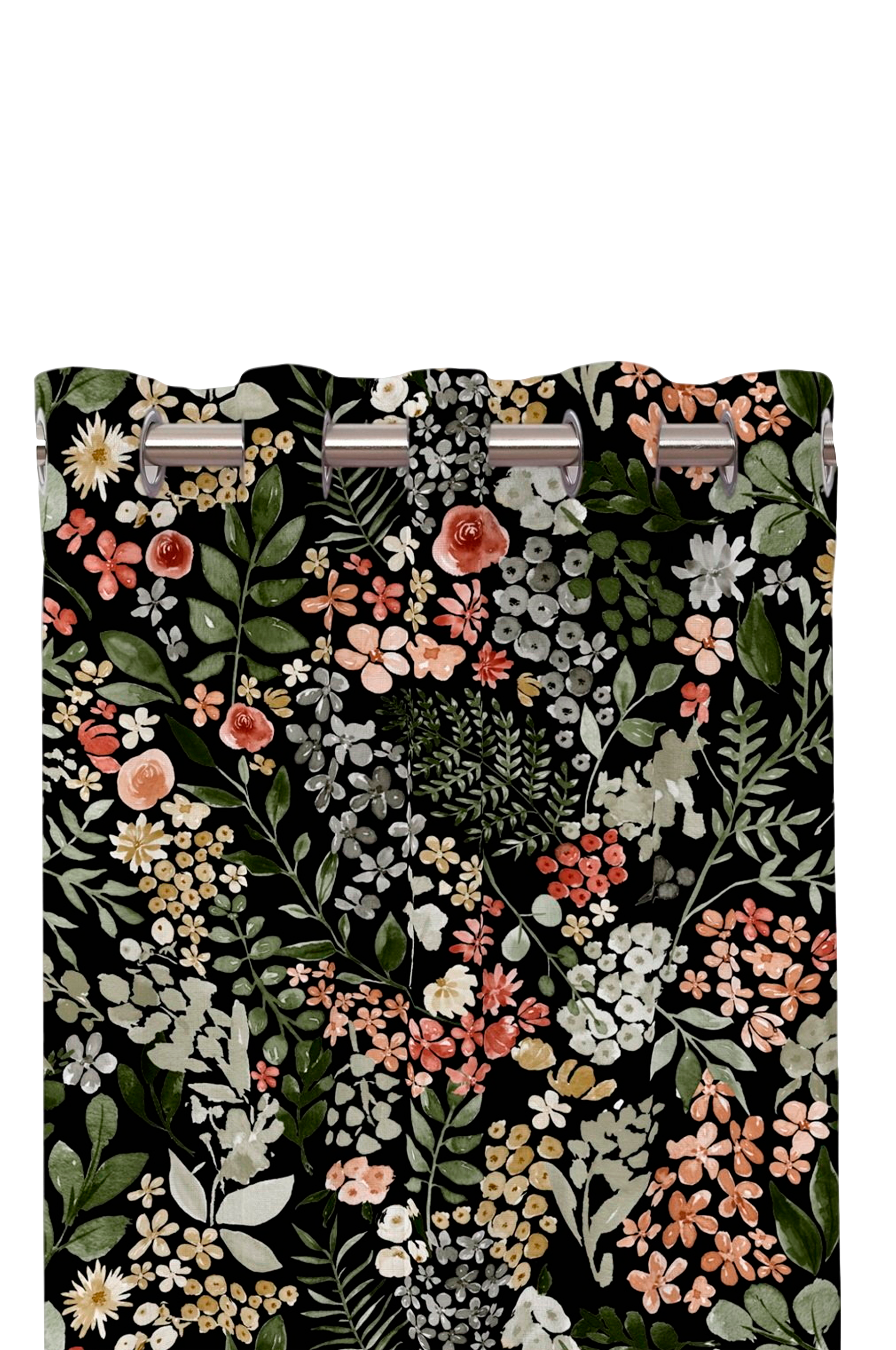 Ferdige gardiner med øyeletter og et nydelig blomstermønster. Trykt på vårt stoff av paris-kvalitet med slub-effekt og overlocket kant.