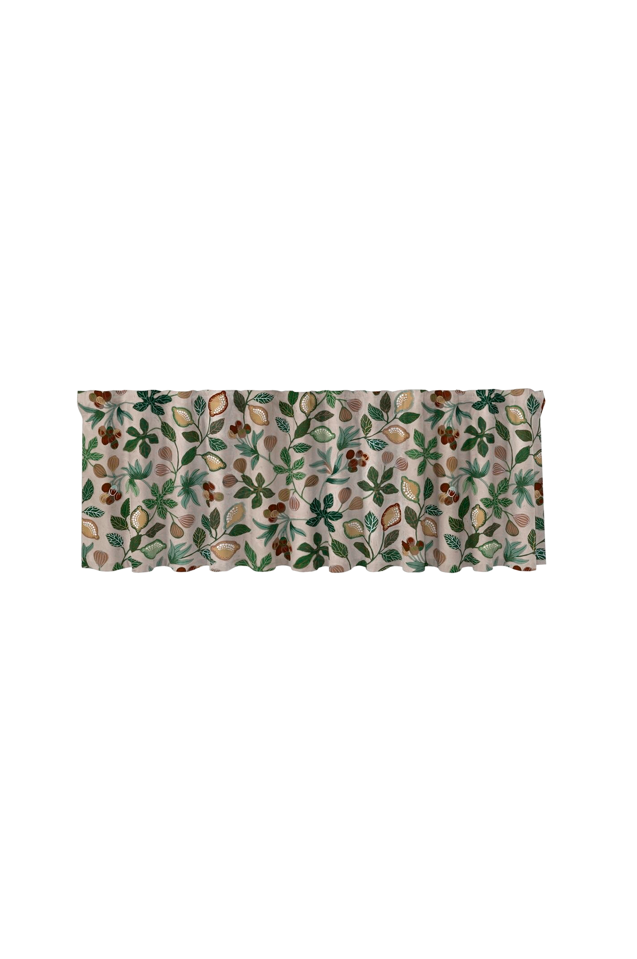 Flerbåndsvolang med forskjellige frukter og blader. Trykt på toveis slub for en fin slub-effekt. Mønsteret er designet av en svensk designer.