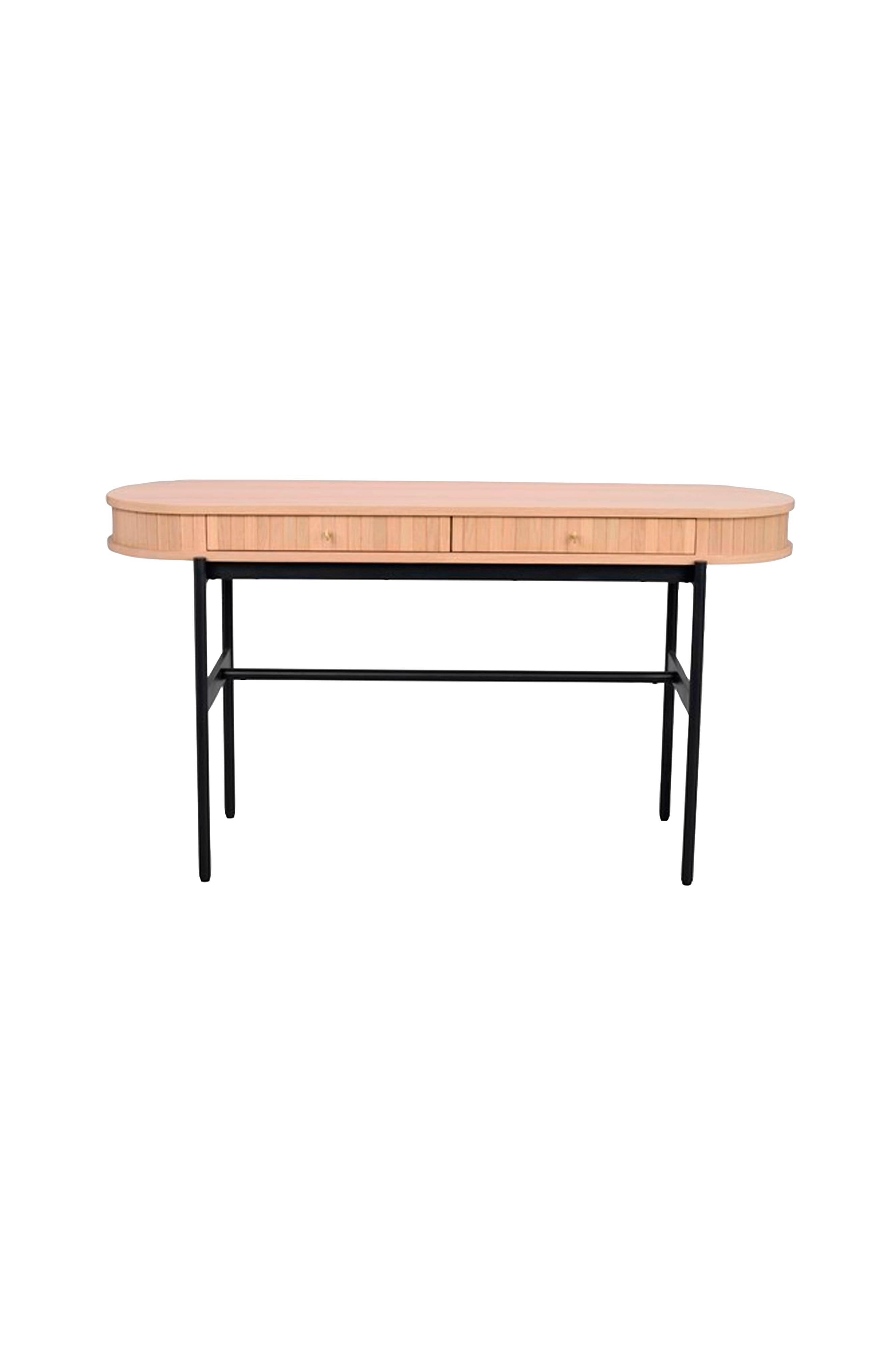 Avlastningsbordet Haddington er med sin ovale form og messingfargede knotter et stilrent og trendy møbel. Det ribbede mønsteret av massiv eik og to praktiske skuffer gjør at Haddington også kan brukes som skrivebord på hjemmekontoret eller som sminkebord på soverommet. Det høye benstativet av pulverlakkert metall i sandstruktur gir rommet en luftig følelse.