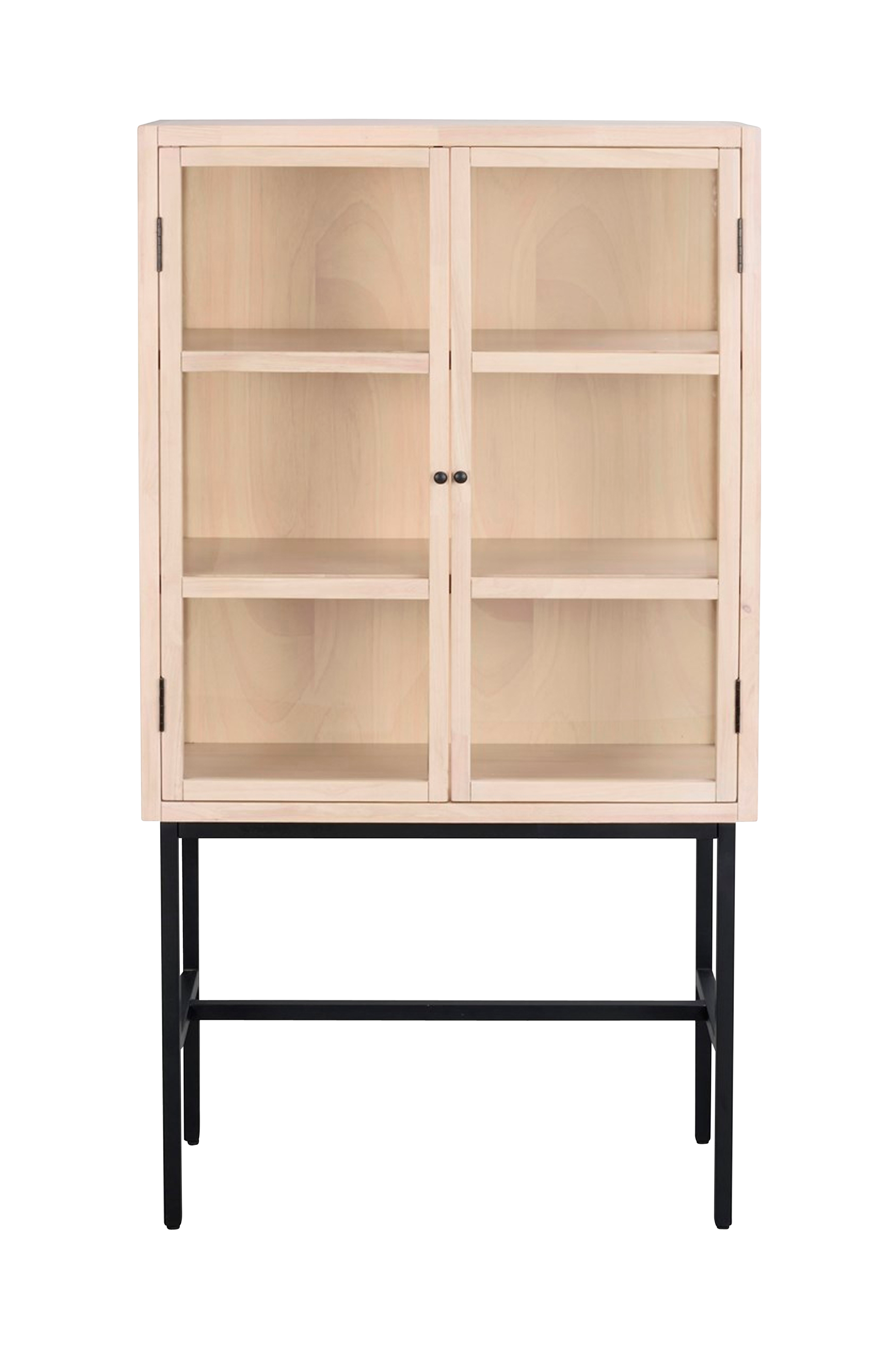 Marshalle vitrineskap med to glassdører, sider av herdet glass og svart understell i metall. Skapet er i hvitpigmentert tre og inne i skapet er det to hyller av tre. Understellet består av pulverlakkert metall med et dekorativt stag for ekstra stabilitet og dekor. Et stilsikkert vitrineskap eller barskap som passer i flere ulike rom og miljøer. Marshalle finnes også i helsvart utførelse og som skjenk.