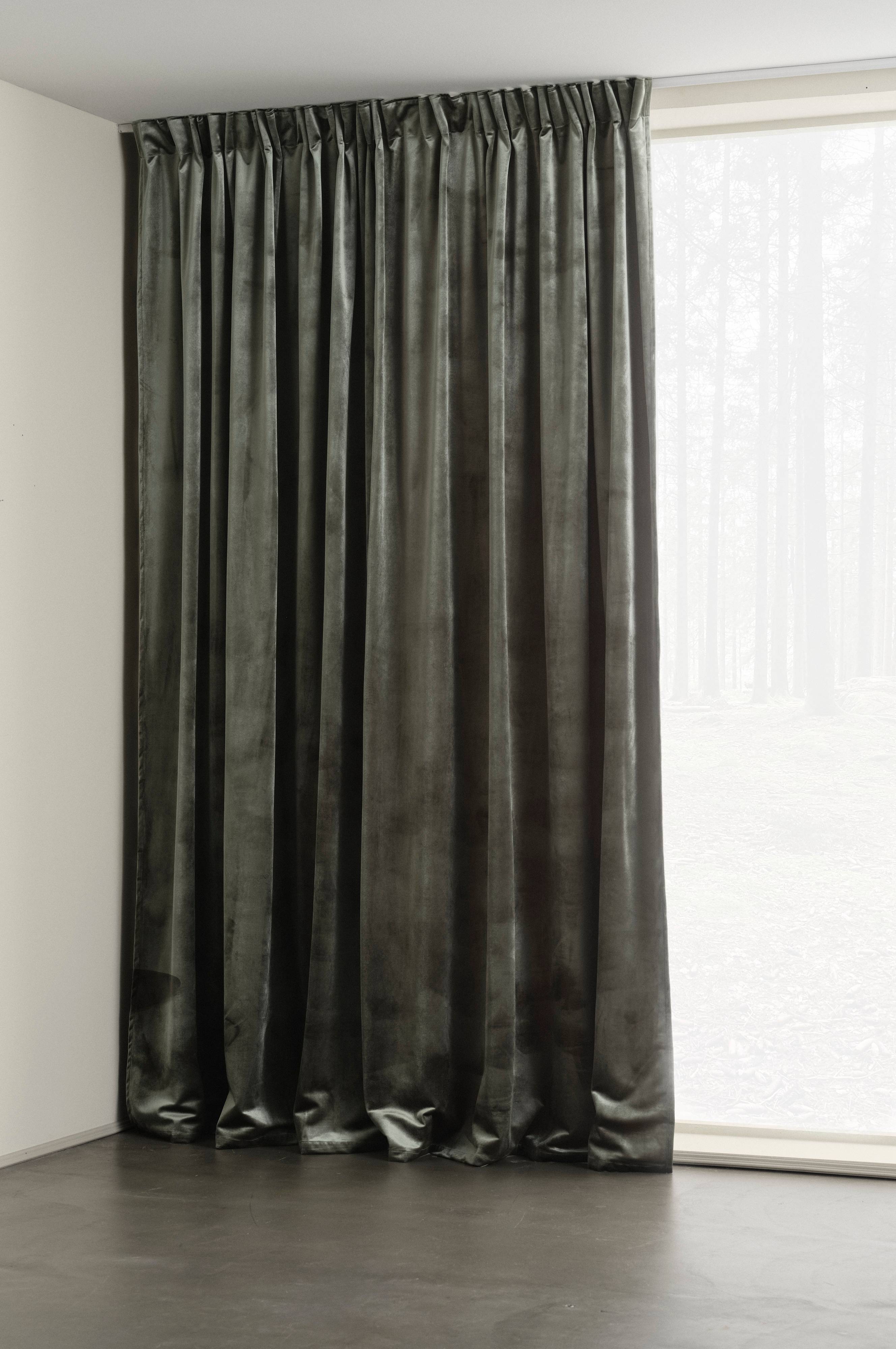 Gardinlengde i elegant fløyel av polyester. Fløyelen skimrer vakkert. Fargenyansen oppleves ulik avhengig av hvordan lyset faller. Lengden har påsydd multifunksjonsbånd. Gardinen kan henges opp med fingerkroker, løpegang samt skjulte hemper.