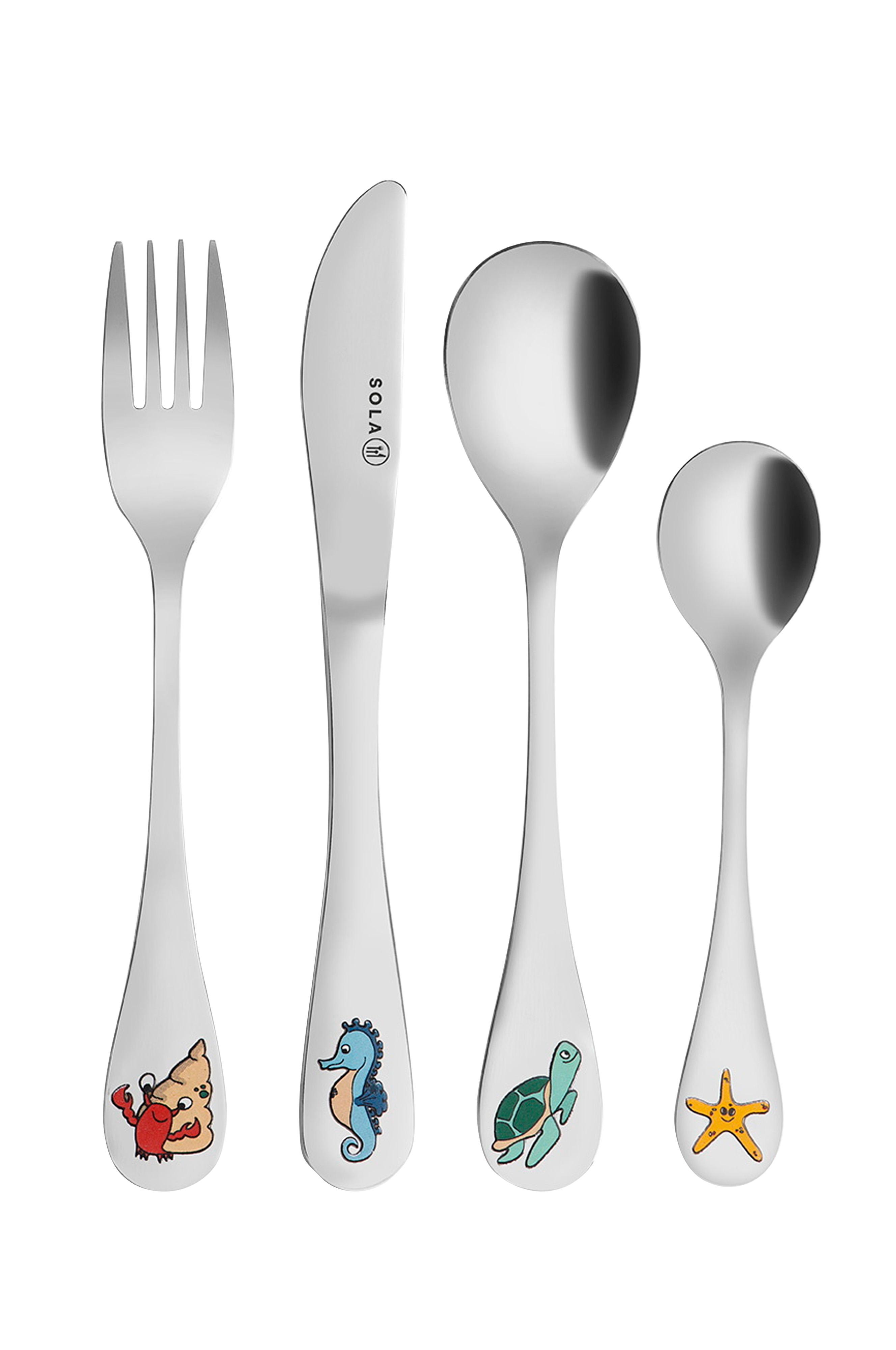 Fint sett med 4 barnebestikk fra Sola. Bestikket er produsert av førsteklasses 18/10 rustfritt stål, og leveres i en fin gaveeske.