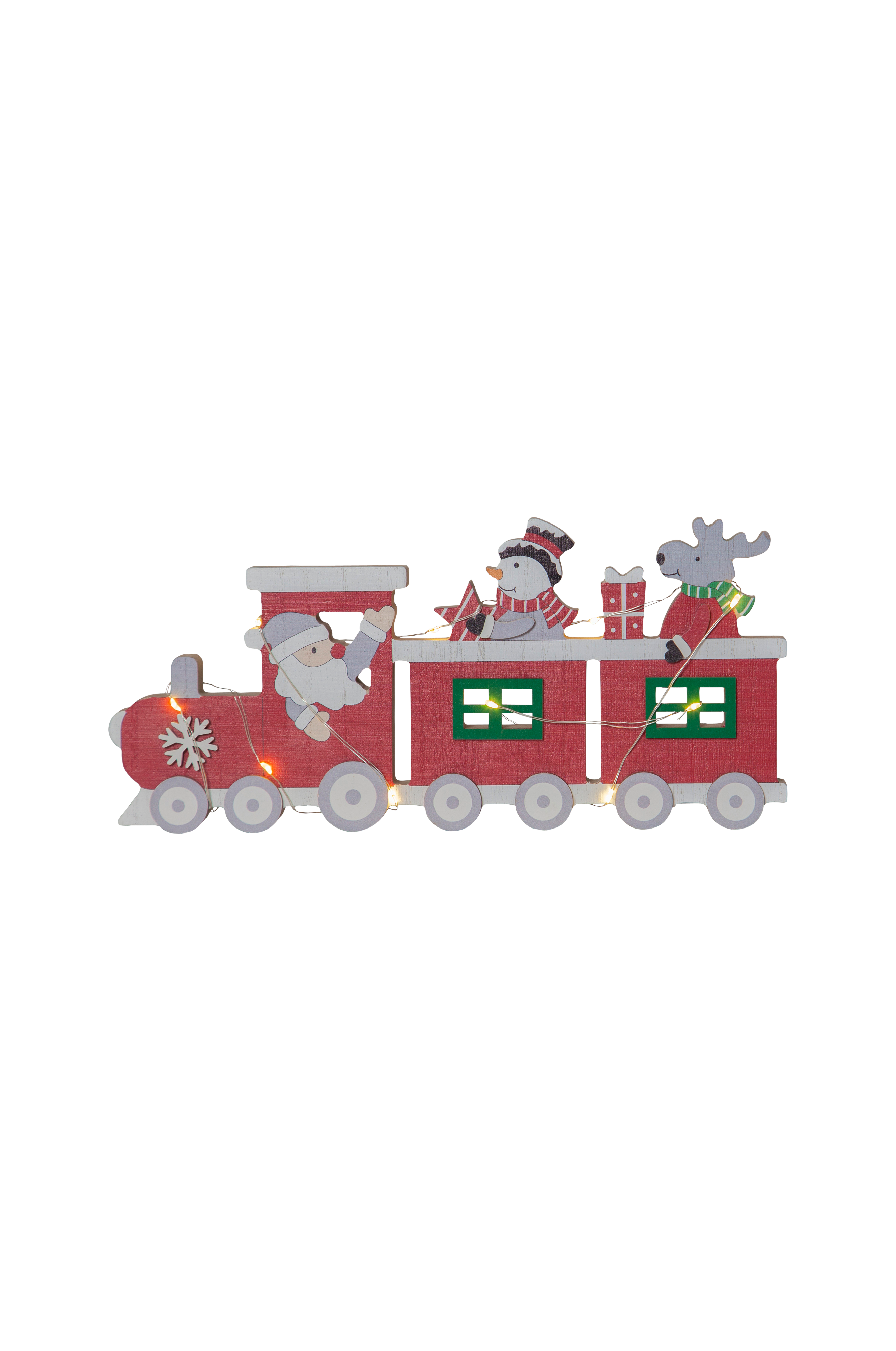 Tog med julenissen som vinker glad i loket, snømannen og reinen sitter på i vognene. En lenke med LED-lys er viklet rundt dekoren. Pynt barnerommet til jul. Den lyser fint i vinduet og gir koselig julestemning.