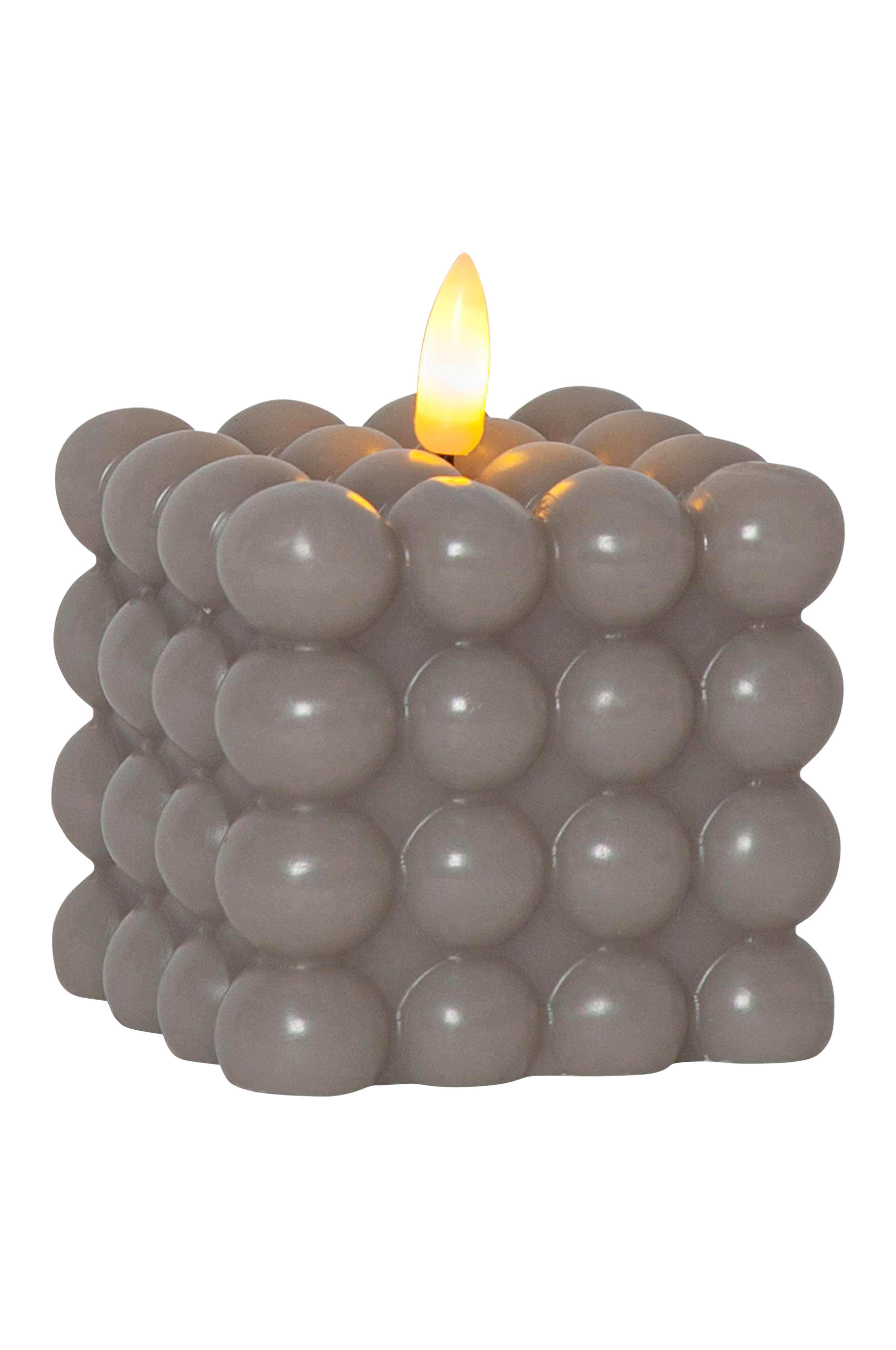 Lys av vokslignende plast, oppbygd til en firkant av runde kuler. Lyset er batteridrevet og har LED-belysning slik at det er helt brannsikkert. Den naturtro flammen er av plast og har varmhvitt lys. Timerfunksjonen gjør det lett å stille inn når det skal lyse, intervallet er 6 timer på og 18 timer av, repeterende. For innendørsbruk.