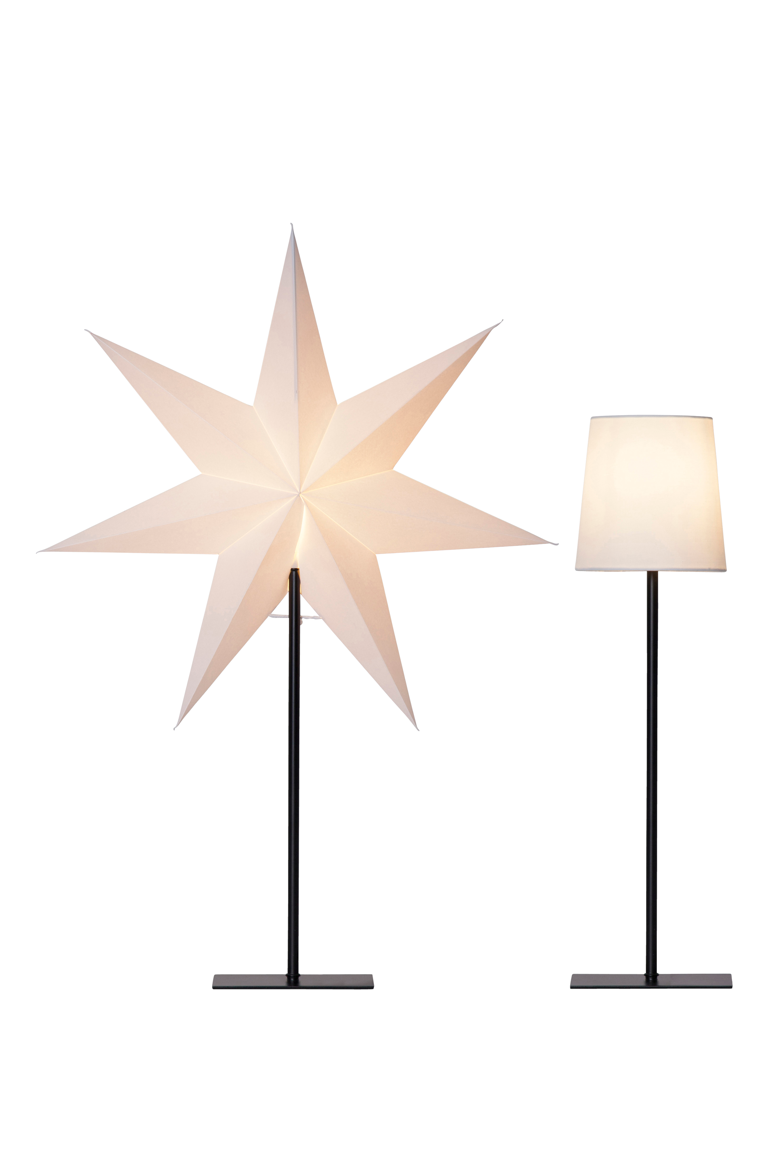 Bordlampe med både stjerne og lampeskjerm slik at du kan bruke lampen hele året. Rett fot av metall. Stjernen er av papp med metallstamme. Skjermen er av tekstil med metallstamme. Svart tekstilledning 1,8 m. Lyspære medfølger ikke.